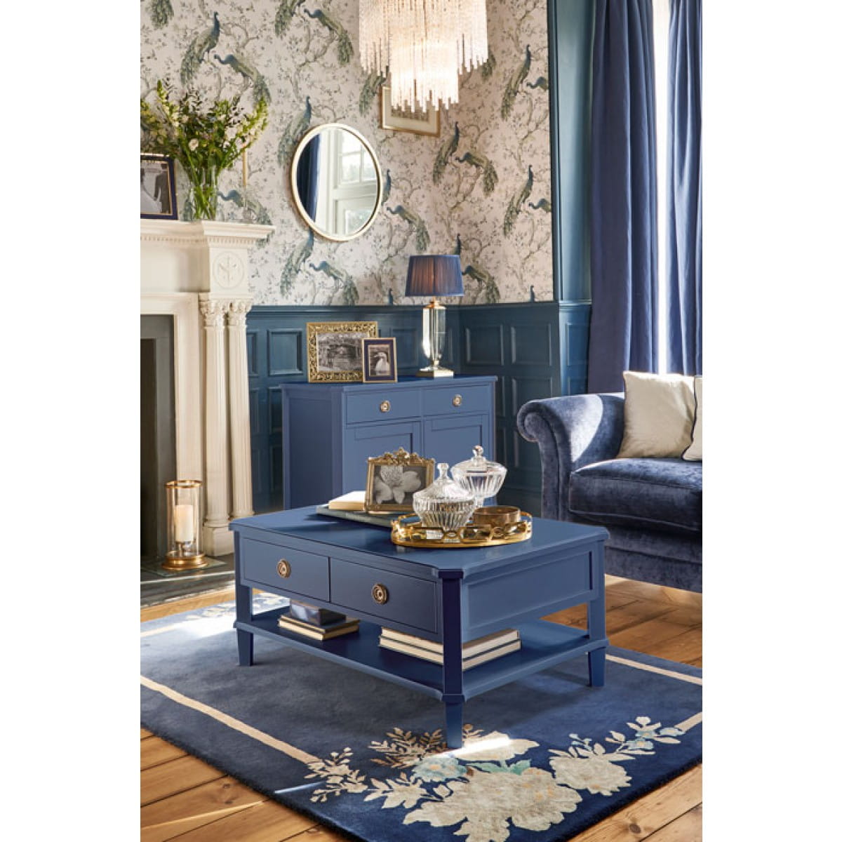 - Dywan: perski wzór w kolorach bordowo-kremowo-granatowych pod strefą wypoczynkową