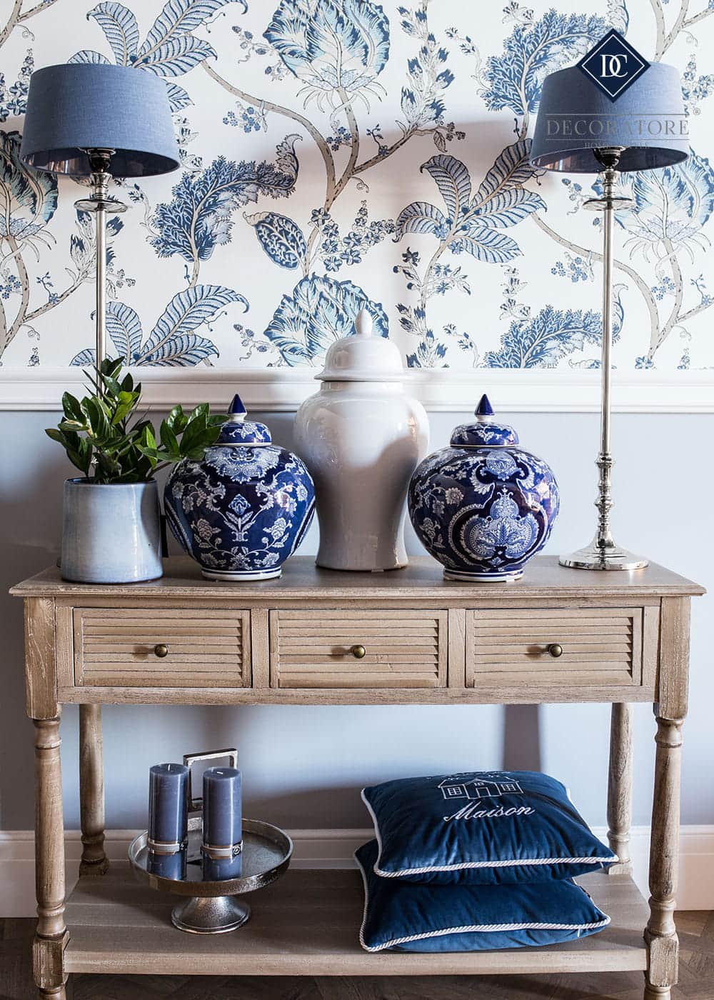 Rozwiązanie: Jeden duży wzór (tapeta), jeden średni (dywan z subtelnym wzorem), drobne akcenty (poduszki w kropki)