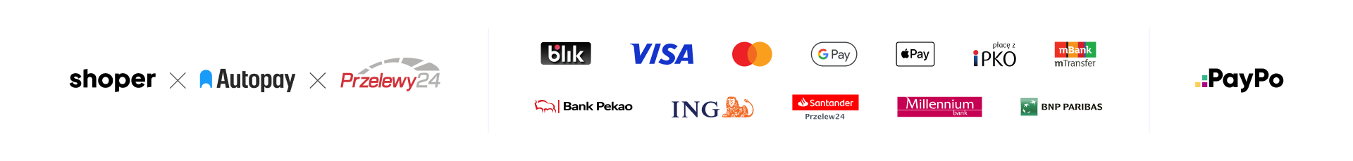 mTransfer, Płacę z Inteligo, MultiTransfer, Płacę z iPko, Przelew24 BZ WBK, Płać z ING, Płać z Nordea, BPH Pay By Link, Pekao24 Przelew, Millennium Płatności Internetowe, Płacę z Alior Bankiem, Płacę z Citi Handlowy, r-Przelew Raiffeisen Bank, Meritum Bank Przelew, Pay Way Toyota Bank, Płać z BOŚ, Alior Sync, Eurobank Płatności Online