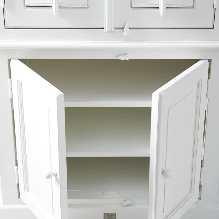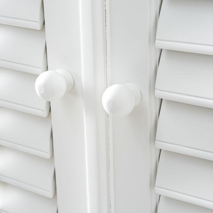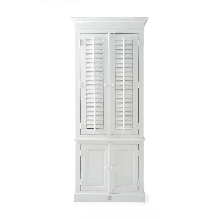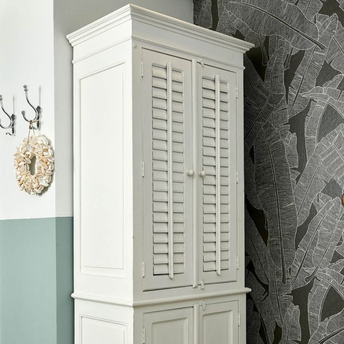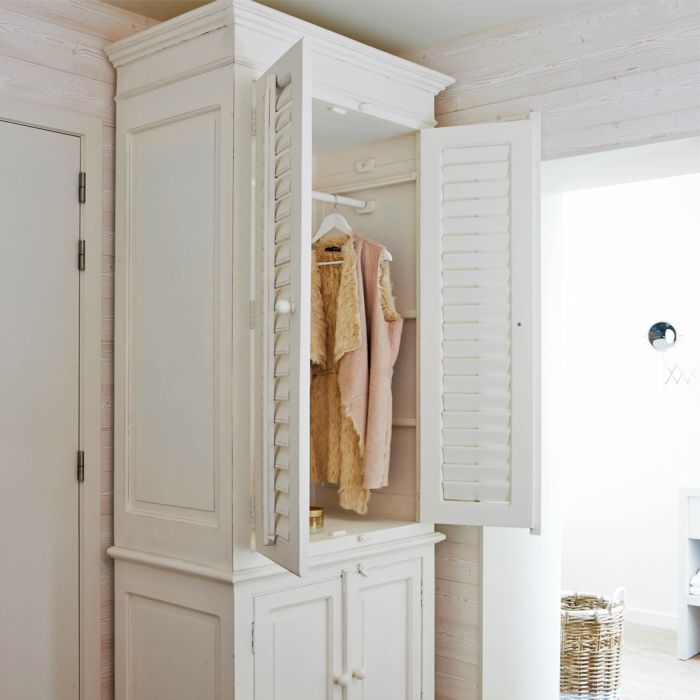 Szafa New Orleans Riviera Maison to biała szafa z drewna akacjowego. bardzo pojemna i przestronna szafa z ruchomymi okiennicami, które nadają jej oryginalnego wyglądu. W górnej połowie szafyznajduje się jedna stała półka, drążek na wieszaki i dwie ruchome półki, a za dolnymi drzwiczkami znajdują się jeszcze trzy stałe półki.