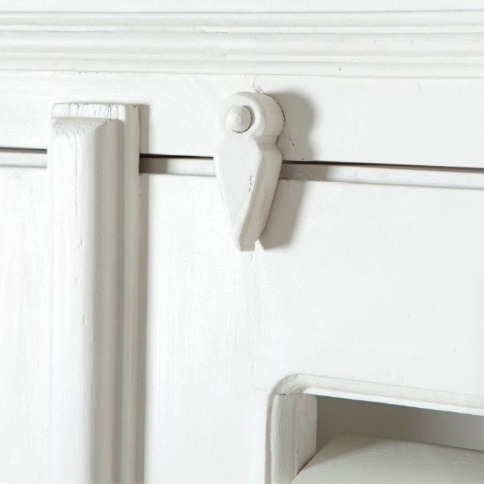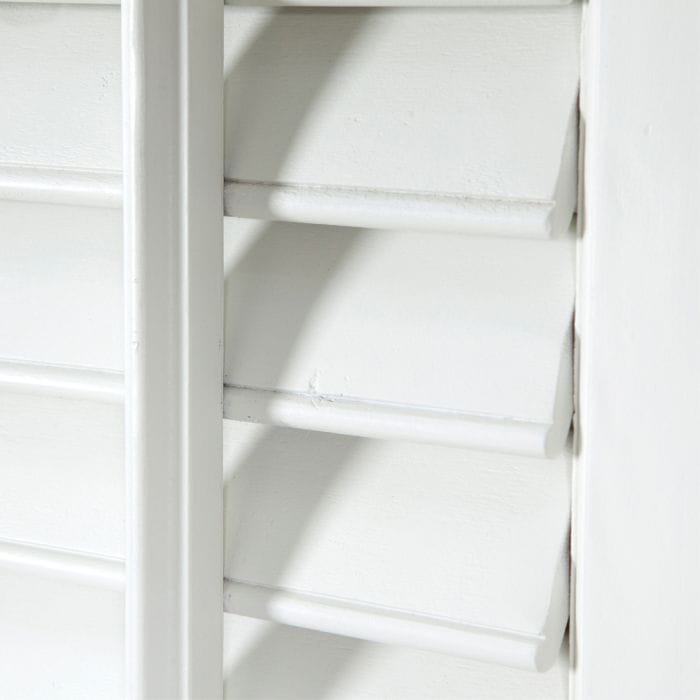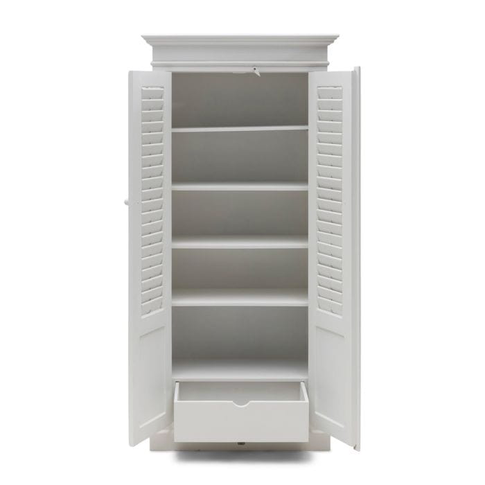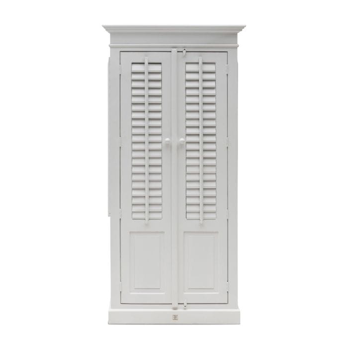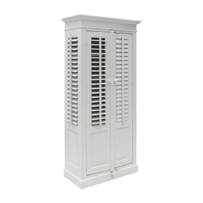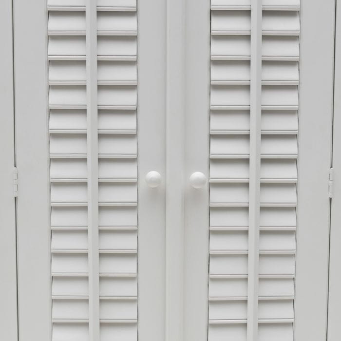 Ta efektowna i solidna biała szafa z żaluzjami wykonana jest z drewna akacjowego i wyposazona jest w ruchome okiennice, zarówno z przodu, jak i z boku. W szafie znajdziesz pięć pojemnych półek oraz dużą szufladę.