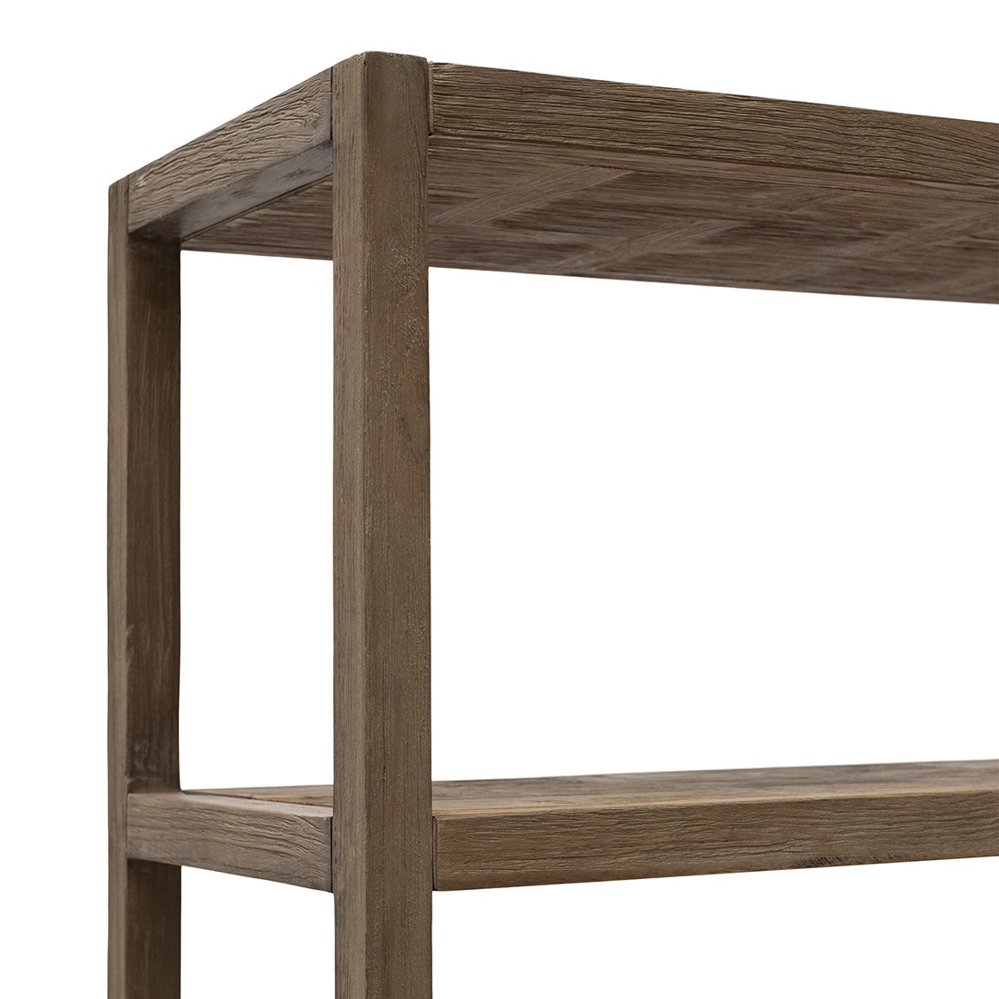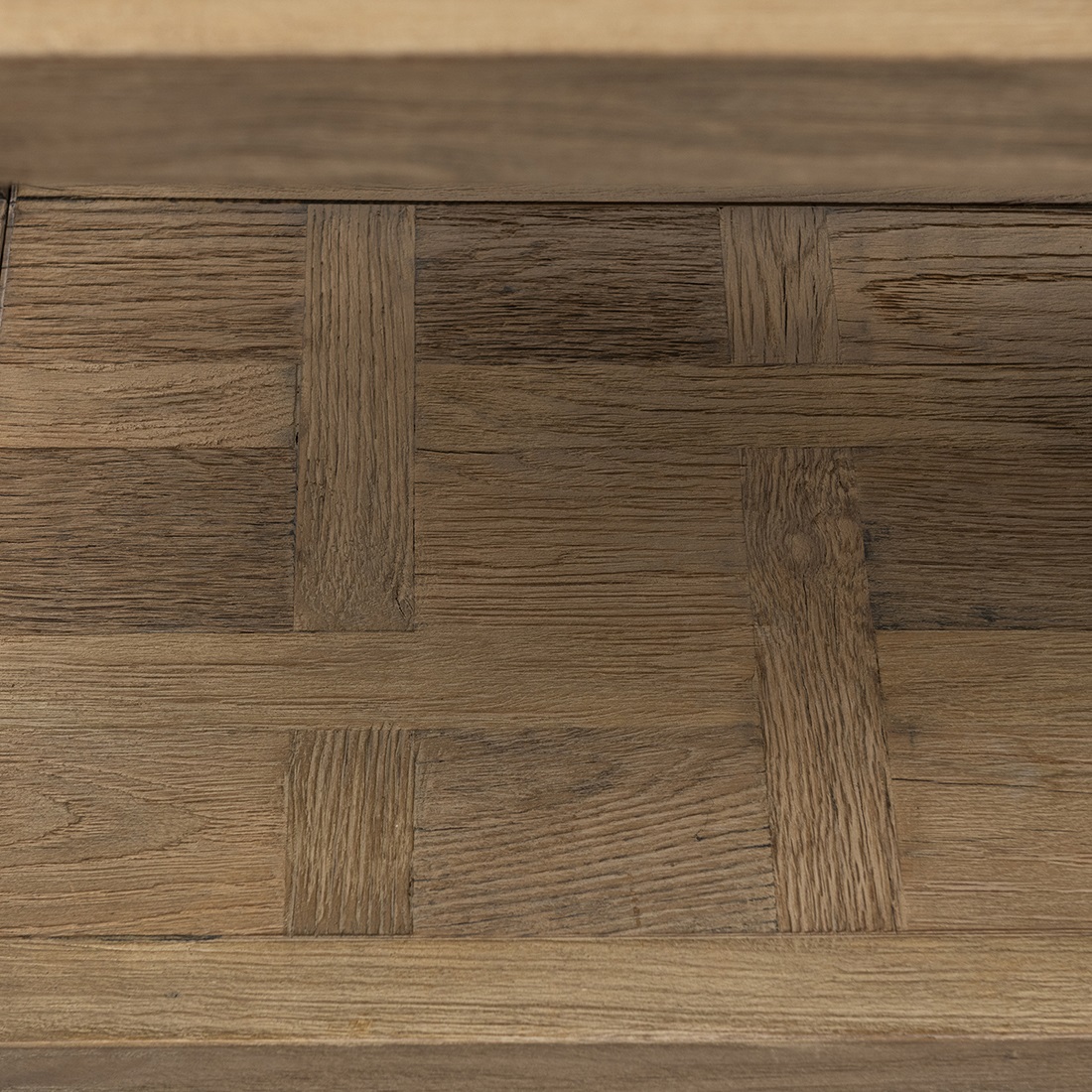 Konsola została wykonana z wysokiej jakości drewna dębowego z odzysku, co podkreśla jej ekologiczny charakter oraz unikalność. Widoczne usłojenie i naturalne niuanse drewna sprawiają, że każdy egzemplarz ma własny, niepowtarzalny wygląd. Blaty z dekoracyjnym wzorem przypominającym parkiet dodają całości eleganckiego wyrazu i ponadczasowego uroku.