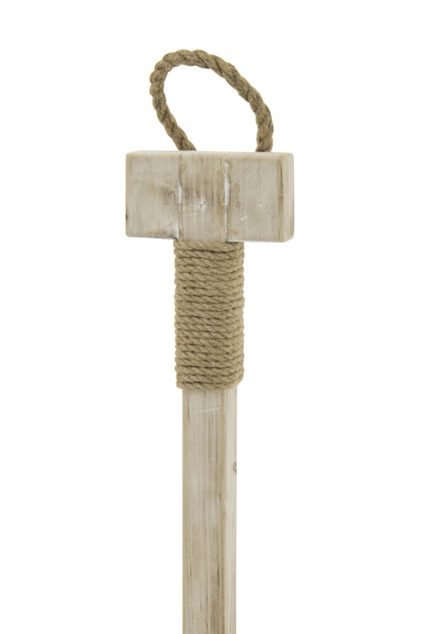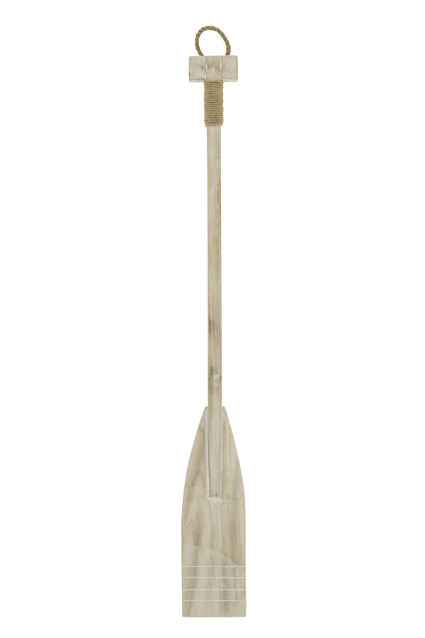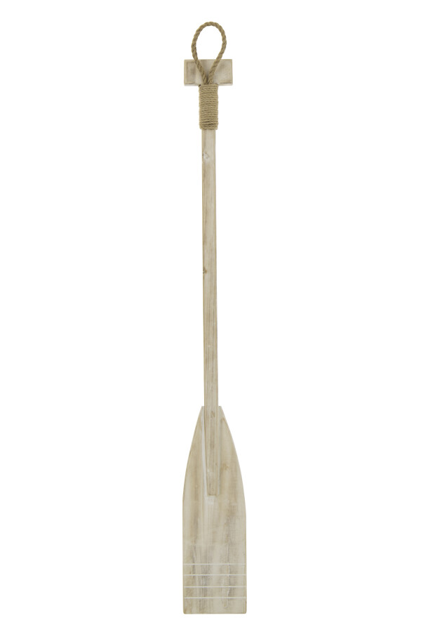 Największym atutem produktu jest połączenie surowego uroku drewna z ozdobnymi detalami. Wiosło z drewna wyróżnia się jasnym, przecieranym wybarwieniem, które pięknie wpisuje się w naturalne aranżacje. Uchwyt wykończony dekoracyjnym sznurem dodaje całości autentycznego charakteru, a delikatne białe pasy na piórze podkreślają marynistyczny styl. Dzięki takiemu zestawieniu dekoracyjne wiosło prezentuje się efektownie zarówno jako samodzielna ozdoba, jak i element większej kompozycji ściennej.