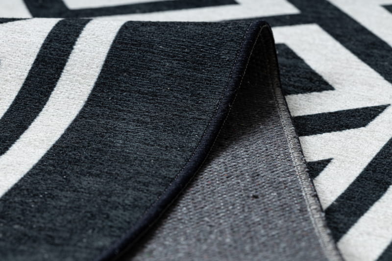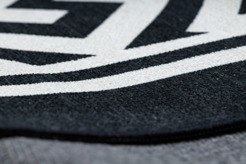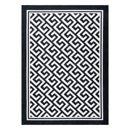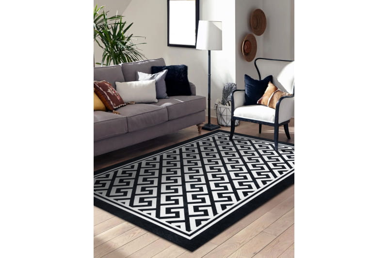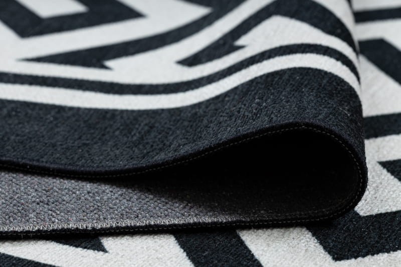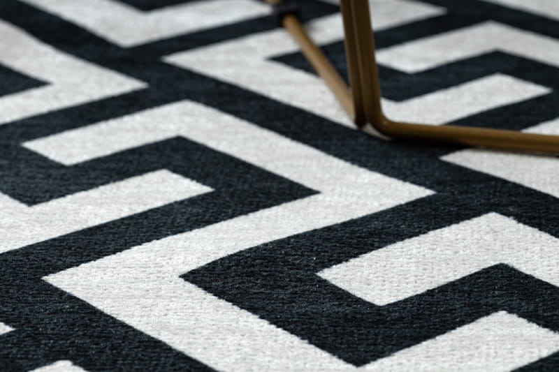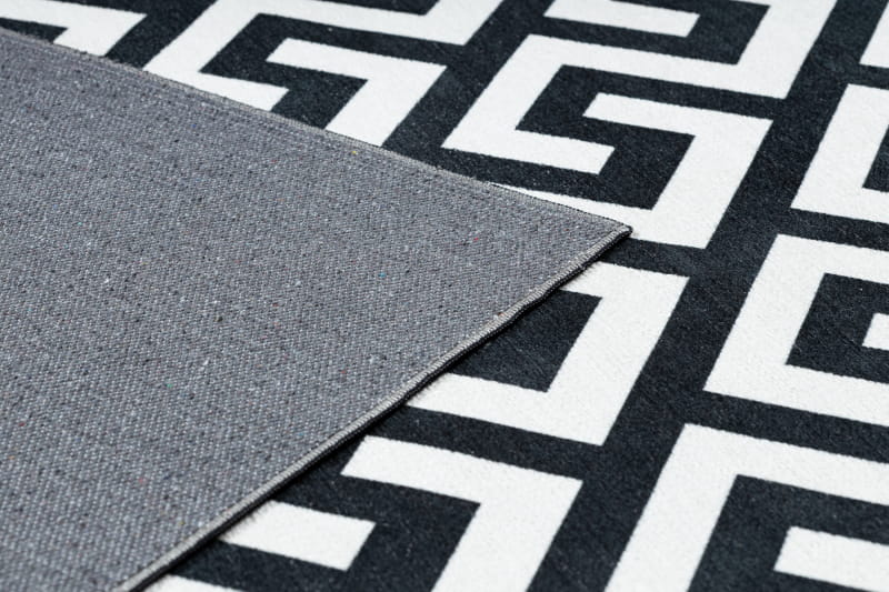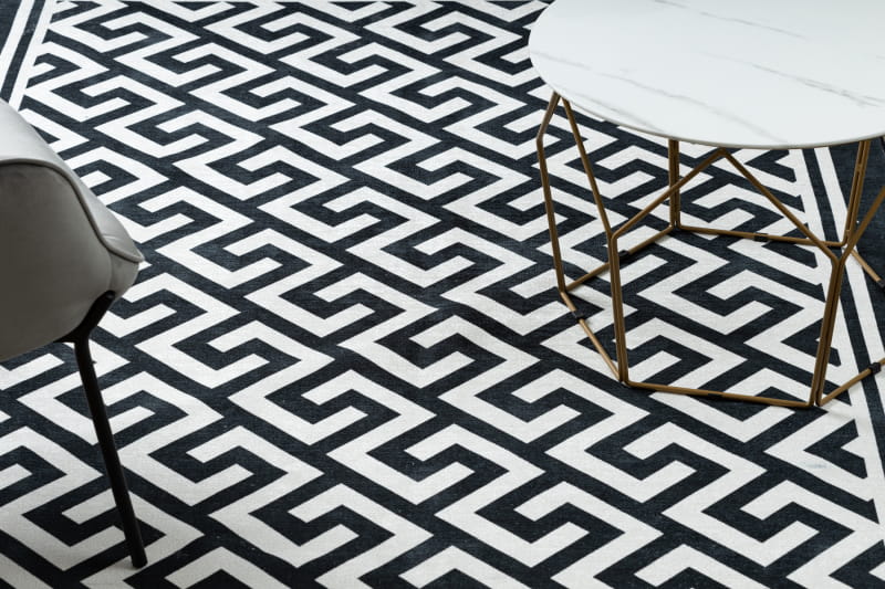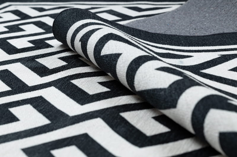 Anticca to geometryczny dywan czarno biały, który wyróżnia się unikalnym wzorem inspirowanym grecką estetyką. Jego kontrastujące kolory – głęboka czerń i czysta biel – tworzą dynamiczny efekt wizualny, który przyciąga wzrok i nadaje wnętrzu nowoczesnego charakteru. Dywan wykonany jest z 80% bawełny i 20% poliestru, co gwarantuje jego trwałość i komfort użytkowania. Waga całkowita wynosi ok. 1,50 kg/m², a grubość to około 5 mm, co sprawia, że jest przyjemny w dotyku i łatwy do utrzymania w czystości.