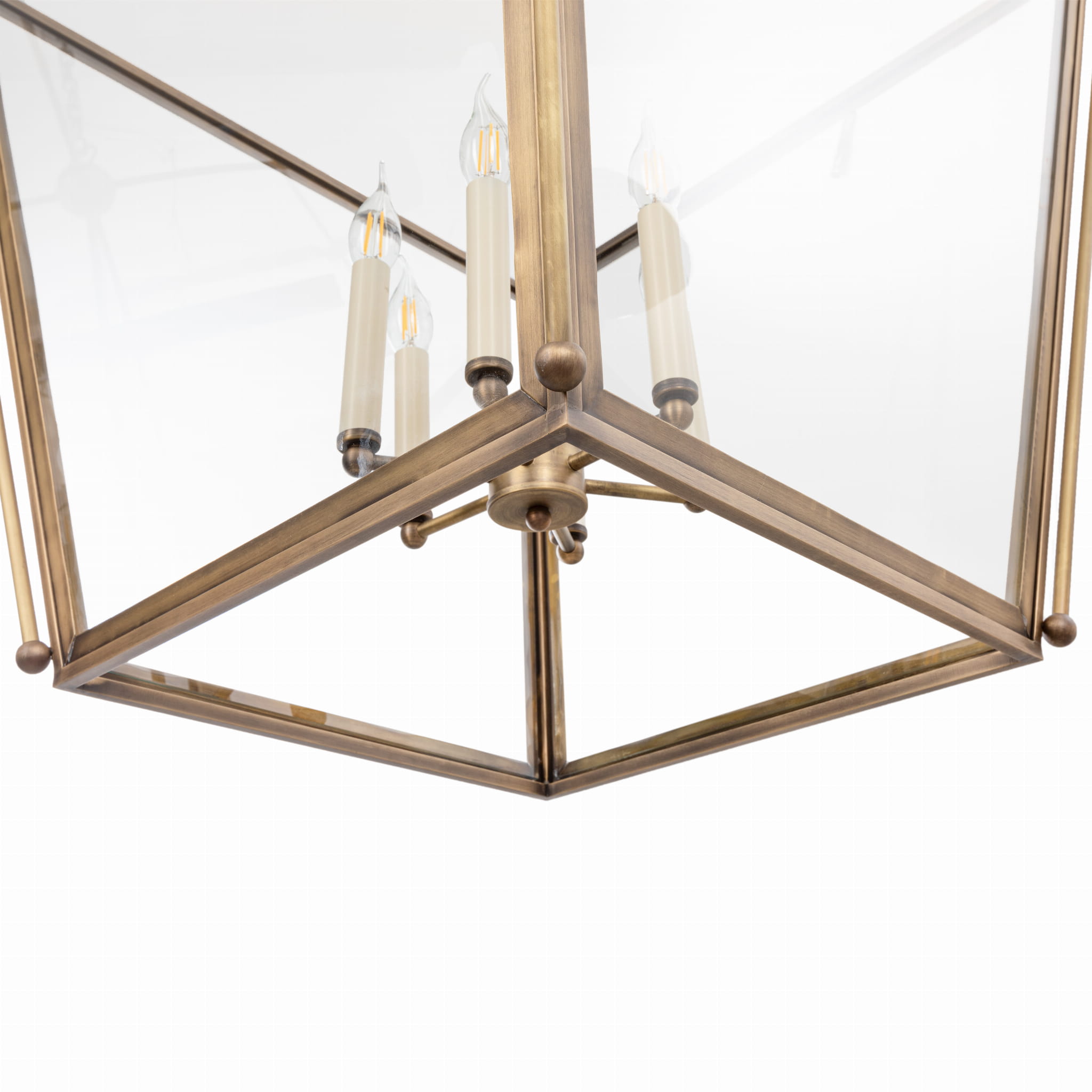 Konstrukcja Efektownej Lampy Sufitowej Antica Mosiądz opiera się na lekkim, metalowym stelażu w odcieniu mosiądzu, uzupełnionym przeszklonymi ściankami. Taka forma przypominająca elegancką latarnię nadaje wnętrzu klasy i przestrzenności. Starannie wykończone detale oraz proporcje sprawiają, że całość prezentuje się harmonijnie i ponadczasowo.