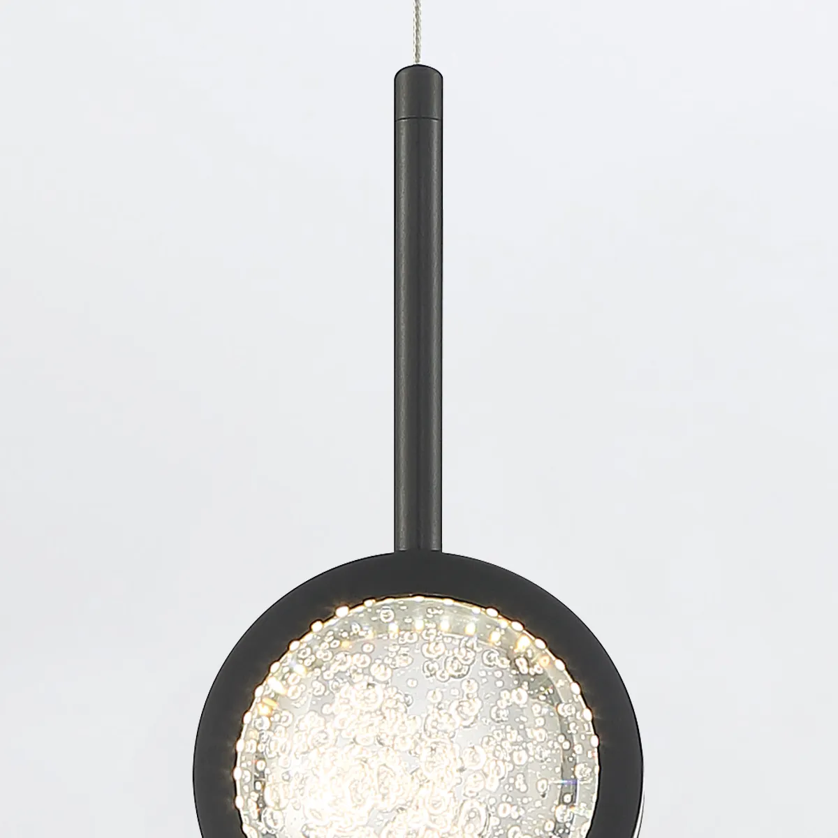 Główną konstrukcję tworzy anodowany pręt w kolorze czarnym, zawieszony pionowo na cienkiej lince. W jego centrum znajduje się przezroczysta, szklana kula z subtelnym, nieregularnym wzorem bąbelków, otoczona matowym pierścieniem anodowanym na czarno. To połączenie faktur i kolorów tworzy harmonijny, geometryczny kształt, który idealnie wpisuje się w nowoczesne wnętrza.