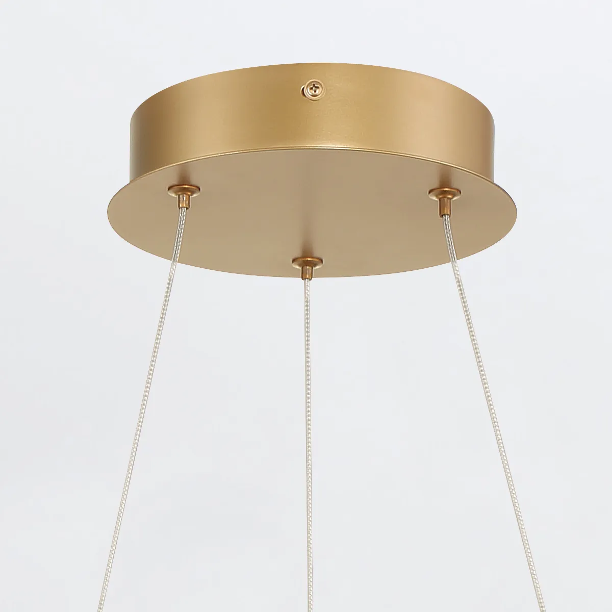 Geometryczna sylwetka żyrandola Cadoux opiera się na dwóch pierścieniach połączonych łukowato wyprofilowanymi ramionami, co nadaje całości lekkości i dynamiki. Konstrukcja wykonana została z trwałego metalu pokrytego złotym szczotkowanym wykończeniem, które subtelnie odbija światło. Wbudowany pasek LED, biegnący wzdłuż całej wewnętrznej strony ramy, gwarantuje jednolite i efektowne oświetlenie przestrzeni.