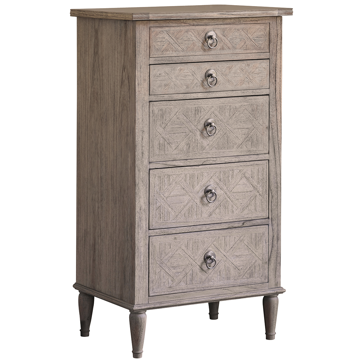 Klasyczna Komoda Beżowa Mustique oferuje pięć pojemnych szuflad, idealnych do uporządkowania garderoby, bielizny czy drobnych akcesoriów. Solidna konstrukcja z jesionu mindy zapewnia niezwykłą trwałość i stabilność, co czyni mebel inwestycją na długie lata. Zyskaj doskonałą organizację przestrzeni dzięki ergonomicznej budowie.