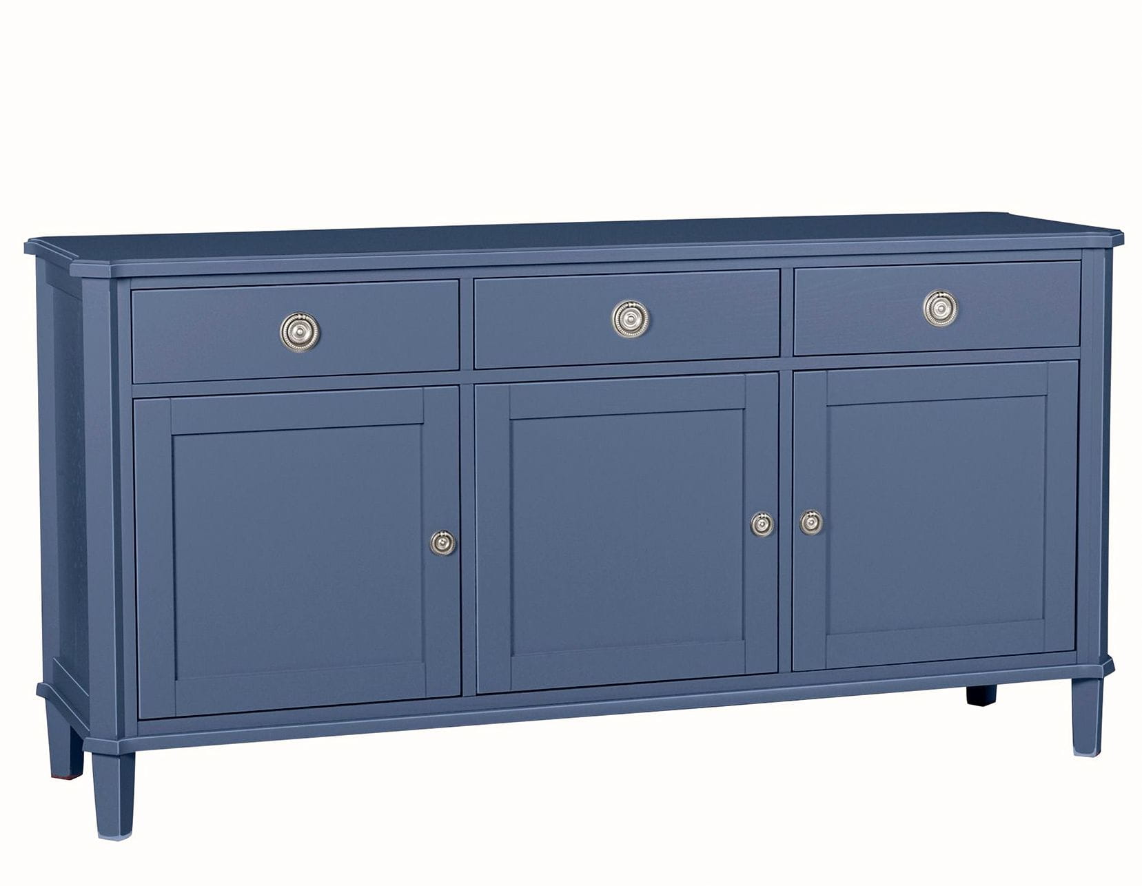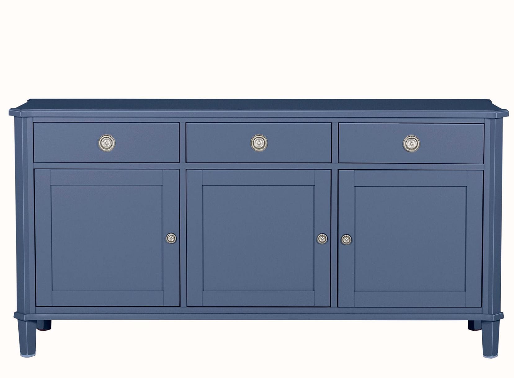 Komoda Henshaw w kolorze niebiesko-szarym, przecieranym, o wymiarach 158x47x80cm, posiada trzy szuflady oraz troje drzwiczek.