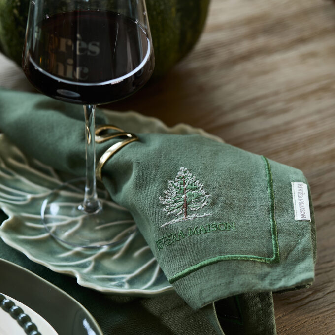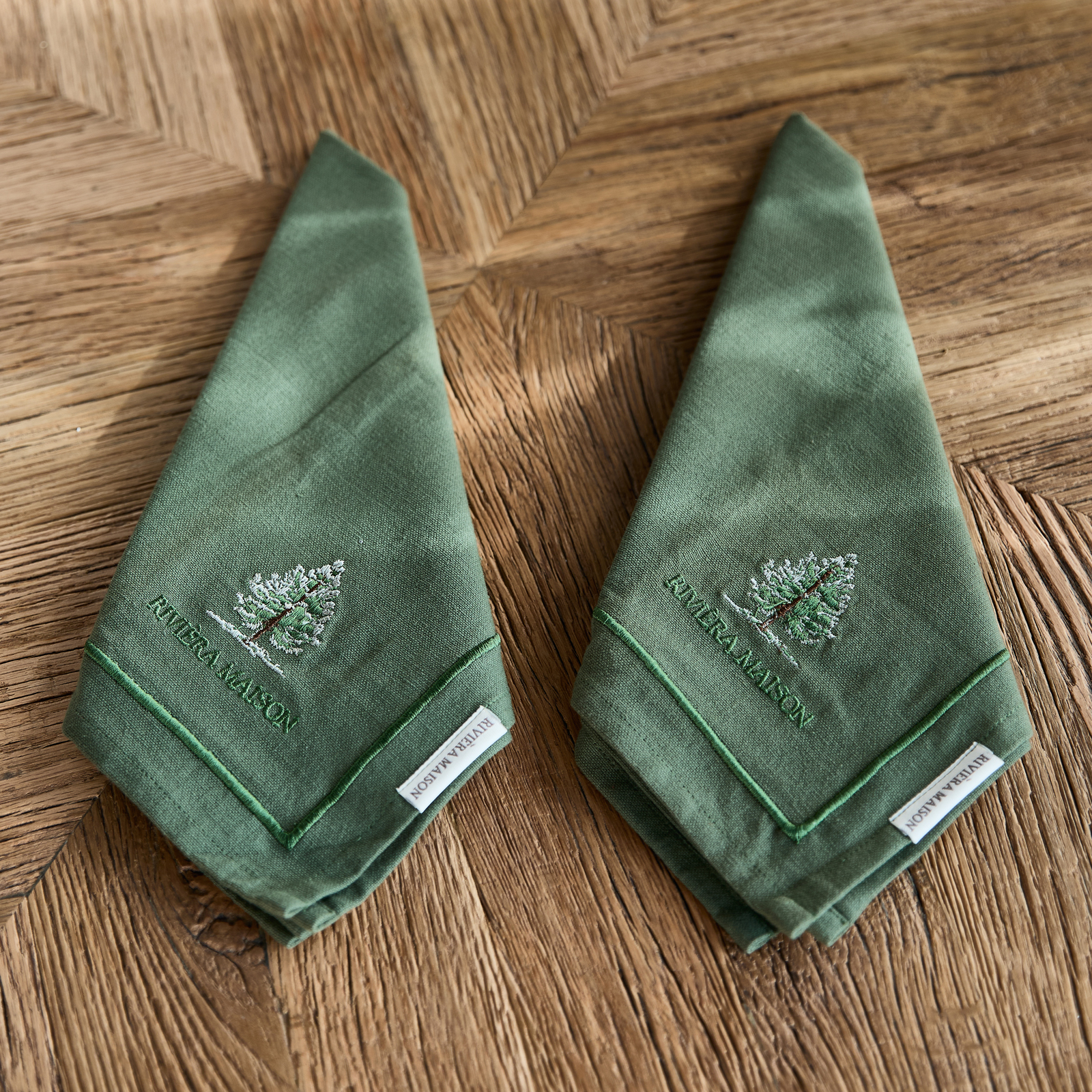 Serwetki wykonane są z wysokogatunkowej bawełny, która zapewnia miękkość, trwałość oraz komfort użytkowania. Utrzymane w głębokim, zielonym kolorze, z ozdobnym haftem w postaci drzewa i subtelnym logo Riviera Maison, stanowią unikalny element dekoracyjny. Klasyczny, kwadratowy kształt o wymiarach 50 x 50 cm pozwala na różnorodne formy składania – od tradycyjnych po fantazyjne. Subtelne wykończenie brzegów dodaje całości elegancji i harmonii.