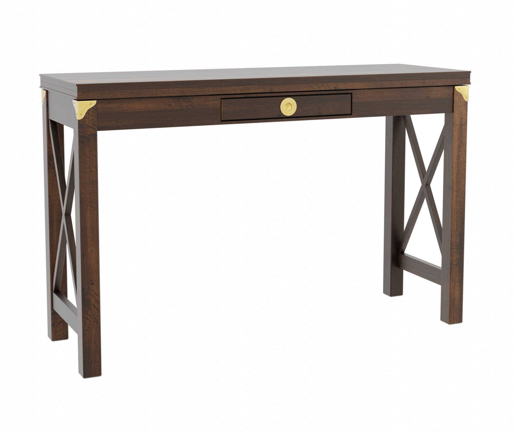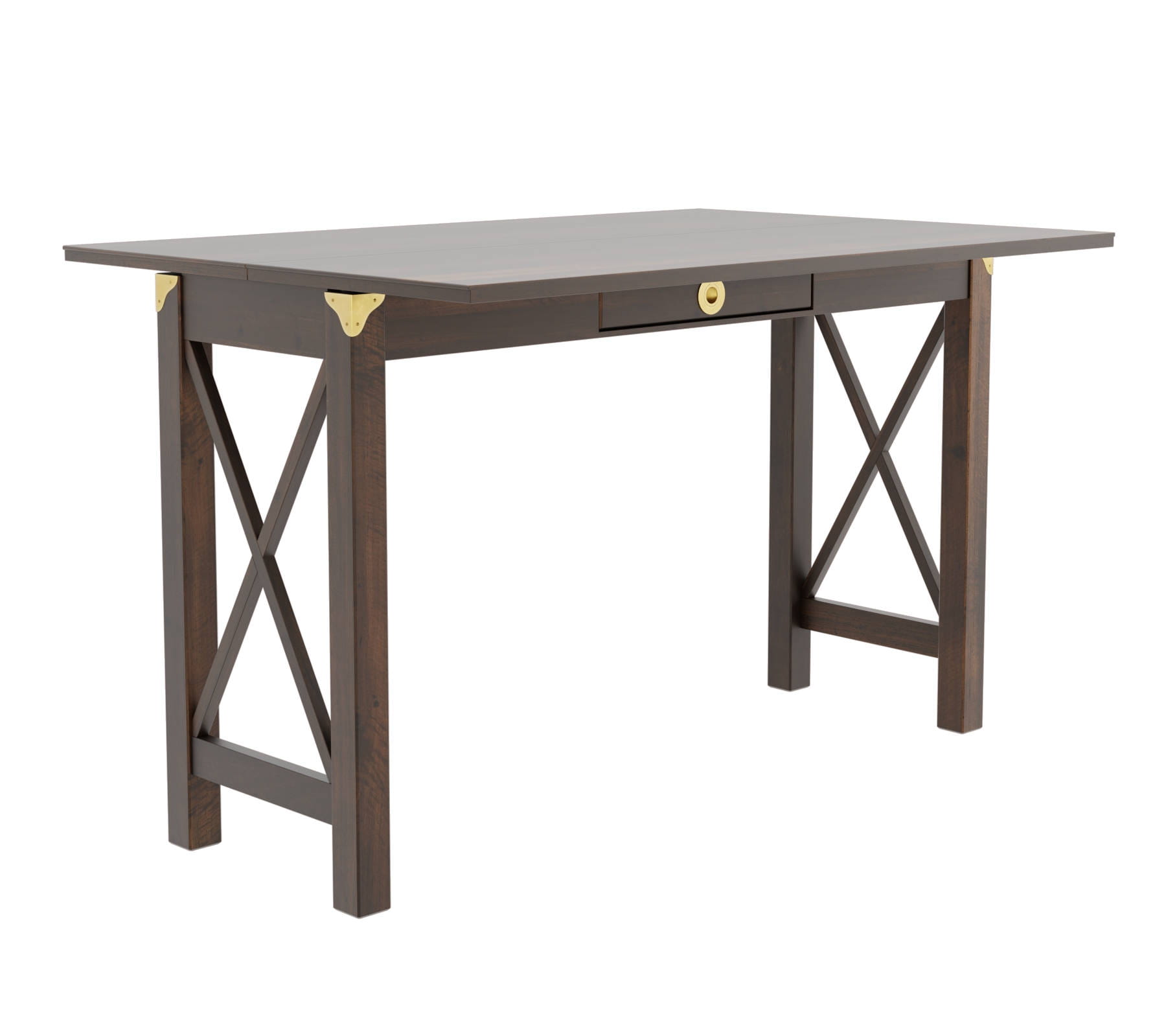 Konsola/stół w odcieniu kasztanowym, o wymiarach 120x40-80x77cm, idealnie wpisze się w aranżację wnętrza w stylu kolonialnym czy modern classic. Konsola posiada jedną szufladę, boki ażurowe, krzyżowane. Blat konsoli rozkłada się, tworząc powierzchnię stołu.