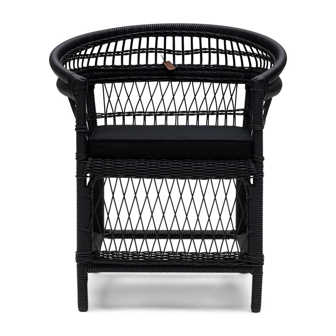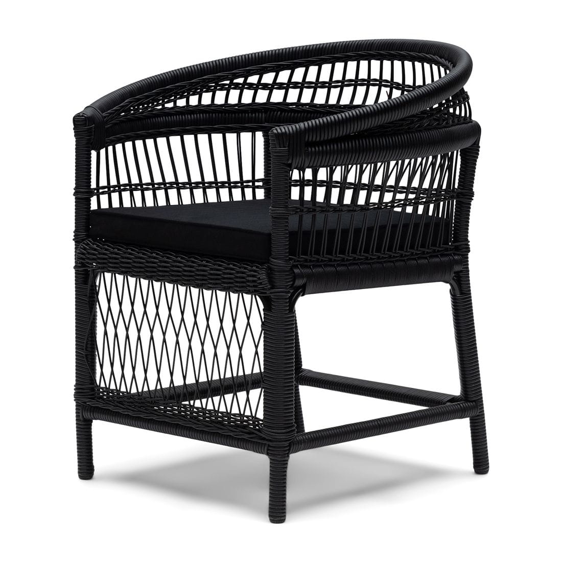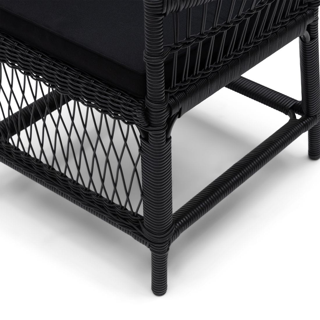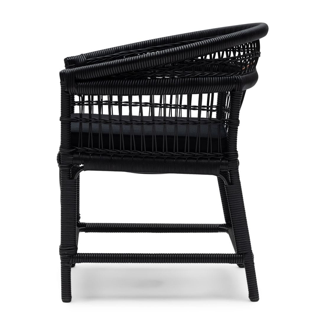 Krzesło wykonane zostało z czarnego, odpornego na warunki atmosferyczne rattanu, który oplata mocną, aluminiową ramę. Materiał ten nie tylko efektownie się prezentuje, ale również wykazuje wysoką odporność na wilgoć, promieniowanie UV oraz zmienne temperatury. Charakterystyczna, otwarta plecionka nadaje meblowi lekkości, jednocześnie zachowując jego solidność i trwałość. Całość uzupełnia bawełniana poduszka w kolorze czarnym, zapewniająca wygodę siedzenia.