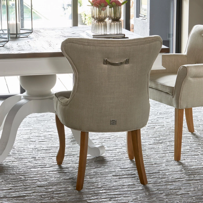 W projekcie krzesła George zwrócono uwagę na każdy element – od lekko zaokrąglonego siedziska, przez subtelnie profilowane oparcie, aż po dekoracyjnie gięte przednie nogi z rzeźbionym detalem. Całość obita została lnianą tkaniną w naturalnym, jasnym odcieniu, która wprowadza do wnętrza lekkość i świeżość. Pikowane oparcie z guzikami w stylu Chesterfield dodaje całości elegancji i klasycznego charakteru.