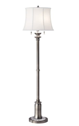 Lampa stojąca, w kolorze antycznego niklu stanowi eleganckie i bardzo efektowne oświetlenie. Doskonale sprawdzi się w salonie czy dużym holu. Lampa posiada biały abażur z tkaniny, włączana łańcuszkiem, z dwoma źródłami światła.