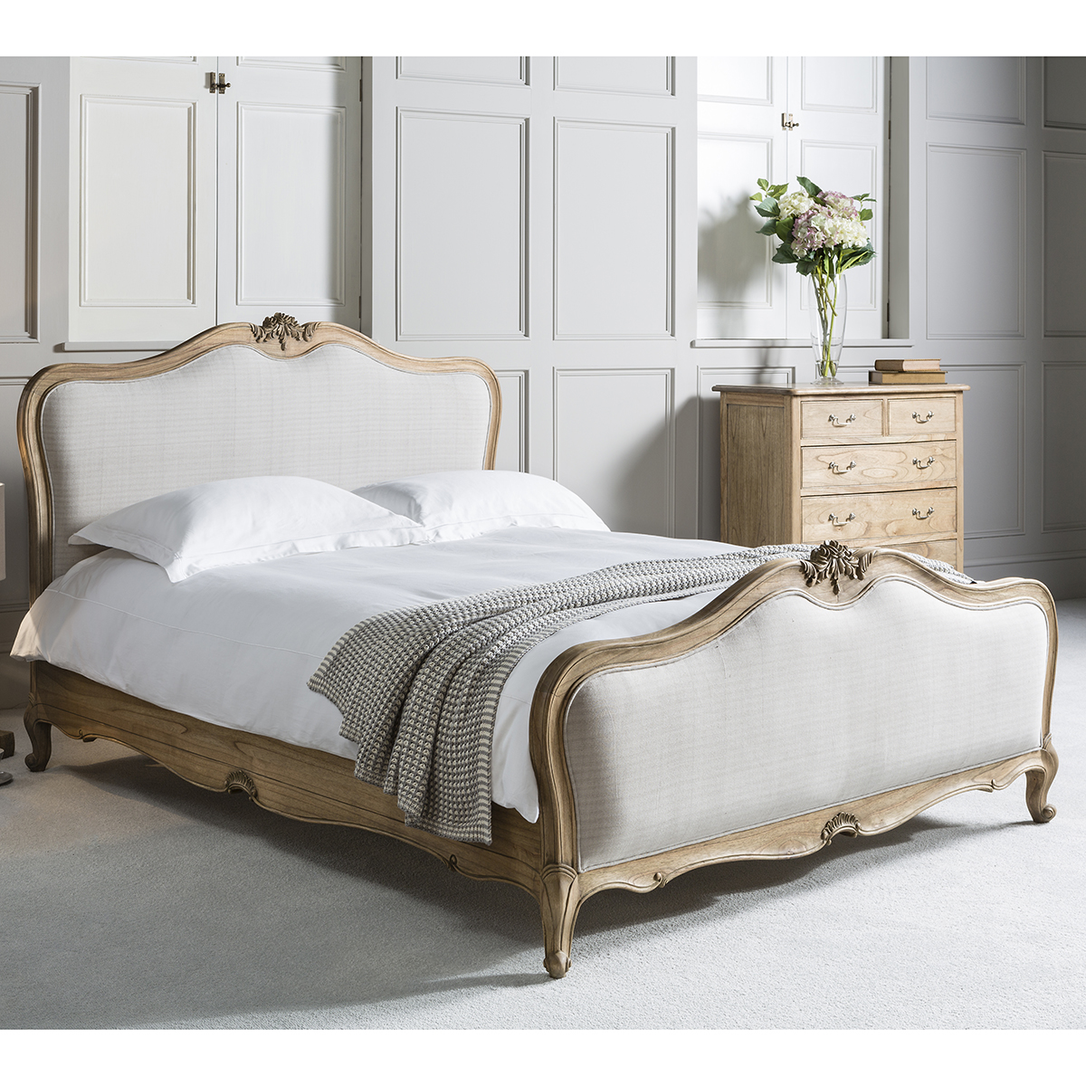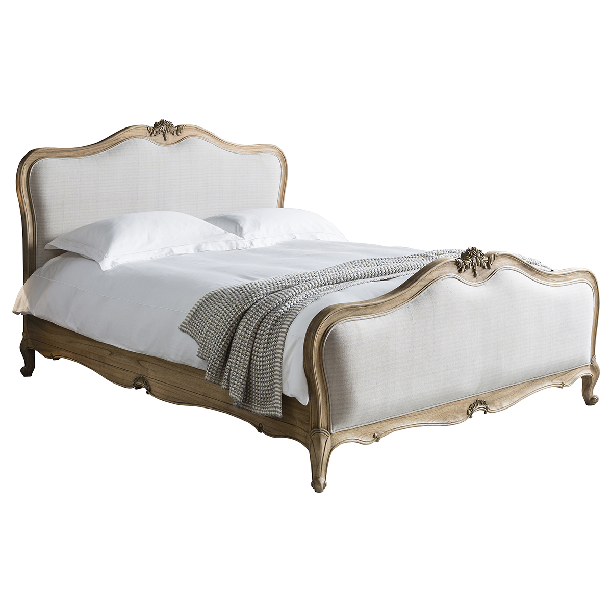 Łóżko charakteryzuje się tapicerowanym wezgłowiem i zanóżkiem, pokrytymi wysokiej jakości lnem w kolorze kremowego beżu. Rama wykonana z drewna mindy w odcieniu jasnego drewna zachwyca ozdobnymi, giętymi kształtami i ręcznie rzeźbionymi detalami. Wymiary 168x215x129 cm zapewniają komfort i wygodę, czyniąc to eleganckie łóżko sypialniane prawdziwą ozdobą.