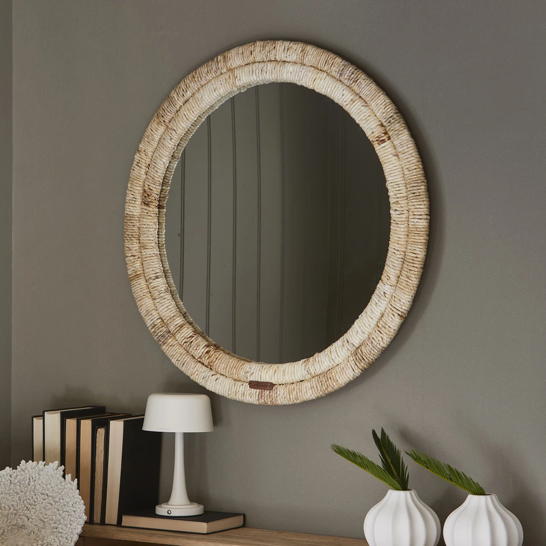 Lustro Marisol wyróżnia się ramą wykonaną z liści bananowca, które nadają mu oryginalnego, naturalnego wykończenia. Subtelne beżowo-brązowe odcienie doskonale wpisują się w paletę barw typową dla stylu boho i rustykalnego, a jednocześnie świetnie współgrają z minimalistycznymi, nowoczesnymi wnętrzami. Solidna konstrukcja oraz ręczne wykonanie sprawiają, że lustro to nie tylko piękne, ale również trwałe. Produkt wpisuje się w ekologiczne trendy, podkreślając zamiłowanie do naturalnych materiałów i zrównoważonego designu.