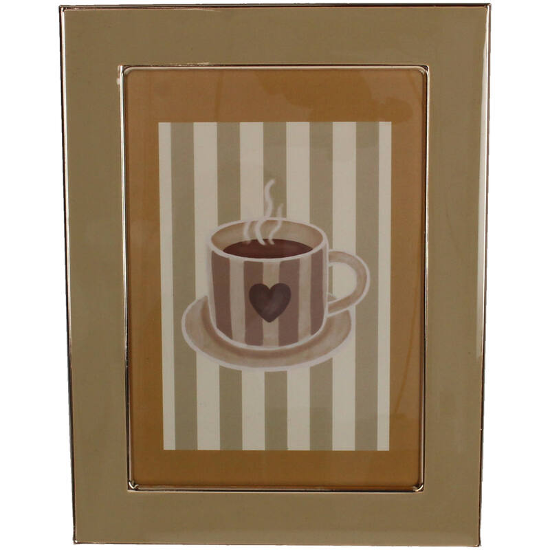 Największą uwagę przyciąga moderna fotolijst z elegancką, błyszczącą ramą w kolorze beżowo-złotym. Wewnątrz znajduje się urocza ilustracja filiżanki kawy z sercem, utrzymana w ciepłej, stonowanej kolorystyce. Taki motyw dodaje całości lekkości i sprawia, że metalowa ramka na zdjęcia staje się nie tylko oprawą dla fotografii, ale również dekoracją budującą nastrój. Format 13x18 cm pozwala pięknie wyeksponować ulubione zdjęcie, grafikę lub print, dopasowując całość do stylu Twojej aranżacji.