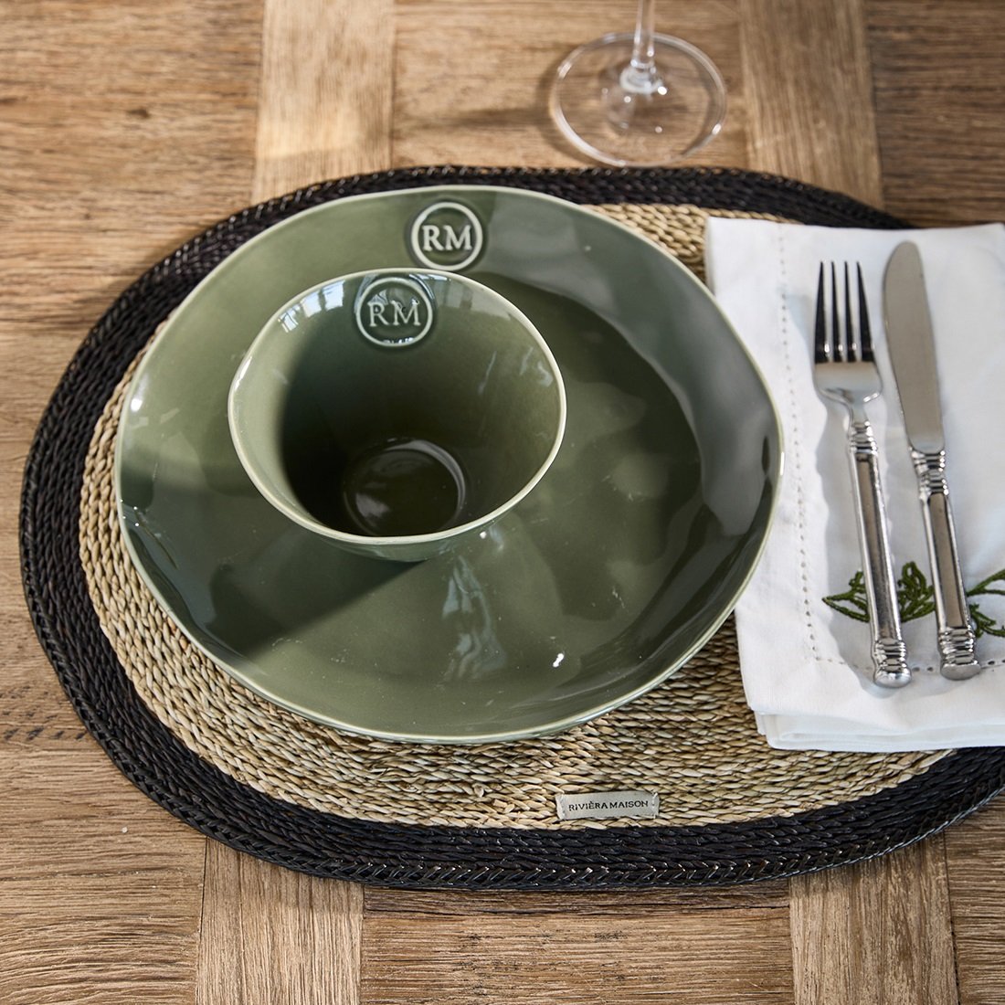 Miska wykonana została z wysokiej jakości ceramiki i pokryta pięknym, matowo-połyskującym szkliwem w głębokim, oliwkowozielonym kolorze. Na wewnętrznej ściance widnieje wytłoczone, charakterystyczne logo RM (Riviera Maison), które podkreśla markowy charakter naczynia i dbałość o detale. Delikatnie nieregularny kształt nadaje misce unikatowego charakteru – każda sztuka może nieco różnić się od pozostałych, co tylko podkreśla jej wyjątkowość.