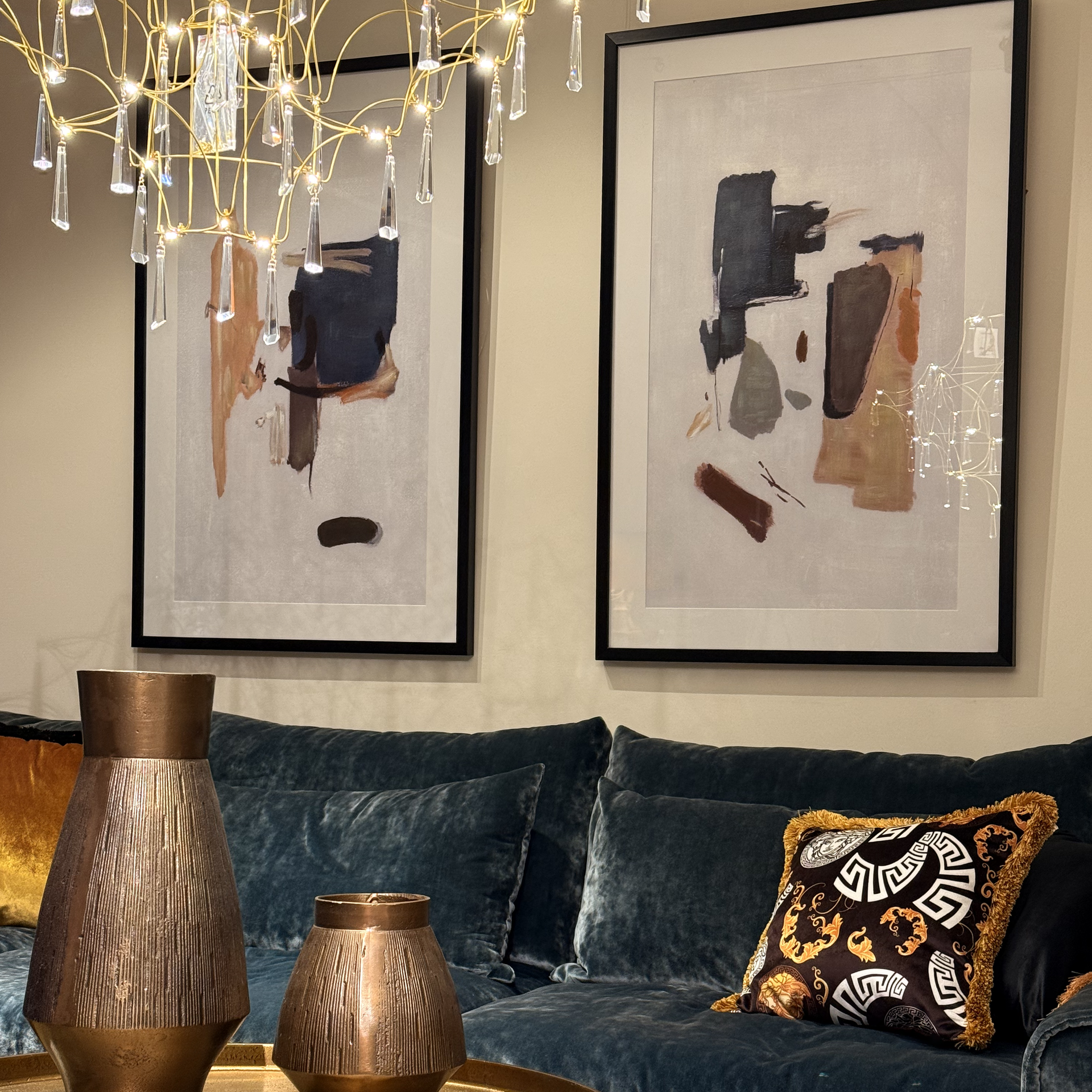 Nowoczesny obraz abstrakcyjny w ramie doskonale wpisuje się w styl modern classic, soft glam, transitional oraz elegancki nowojorski klimat. Najlepiej prezentuje się nad łóżkiem, nad konsolą, w korytarzu albo w strefie wejścia, wszędzie tam, gdzie chcesz dodać wnętrzu harmonii i wyrafinowania.