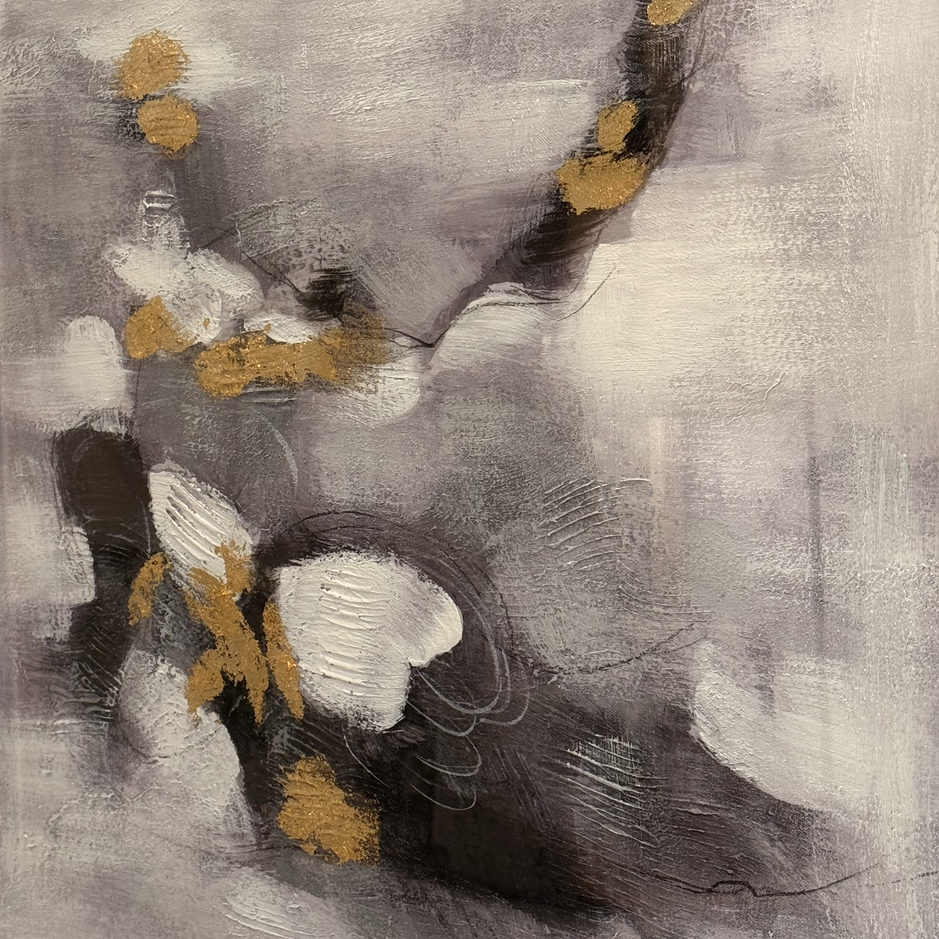 Kompozycja Granite II została utrzymana w ponadczasowej palecie, gdzie dominują biel, czerń i szarość, uzupełnione subtelnymi akcentami w odcieniu zgaszonego złota. Miękkie przejścia barw nadają całości lekkość i elegancję, dzięki czemu dekoracja nie przytłacza aranżacji. Dużym atutem pozostaje rama w kolorze czarnym, która efektownie podkreśla charakter pracy. Dodatkowo białe passe-partout oraz szkło nadają oprawie galerijny wygląd i podnoszą walory estetyczne całej kompozycji. Pole obrazu o wymiarze około 65x65cm zostało pięknie wyeksponowane wewnątrz passe-partout.