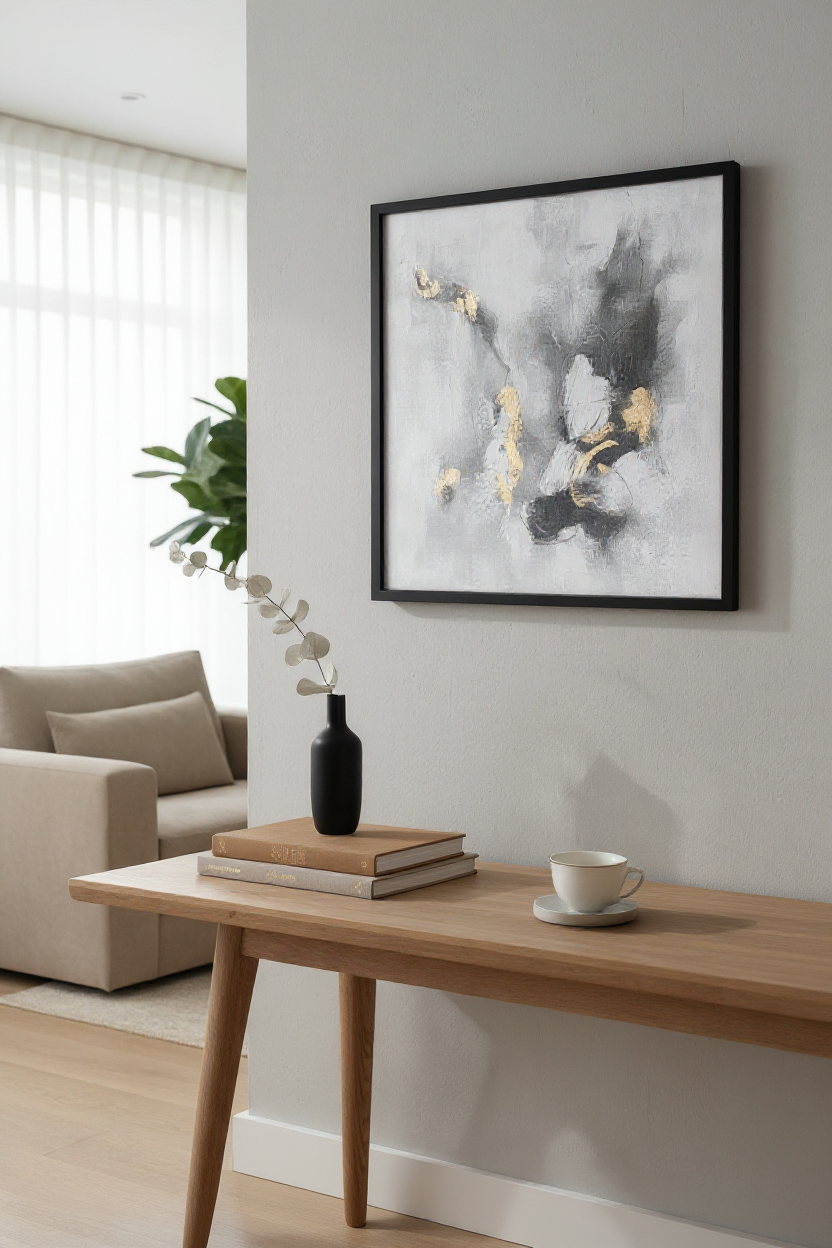 Model Granite II harmonijnie współgra z aranżacjami modern classic, soft glam, transitional oraz eleganckim stylem nowojorskim. Bardzo dobrze wygląda w salonie, gabinecie, sypialni lub reprezentacyjnej strefie dziennej. Czerń ramy i spokojna kolorystyka motywu świetnie łączą się z jasnymi ścianami, miękkimi tkaninami, drewnem i kamieniem.