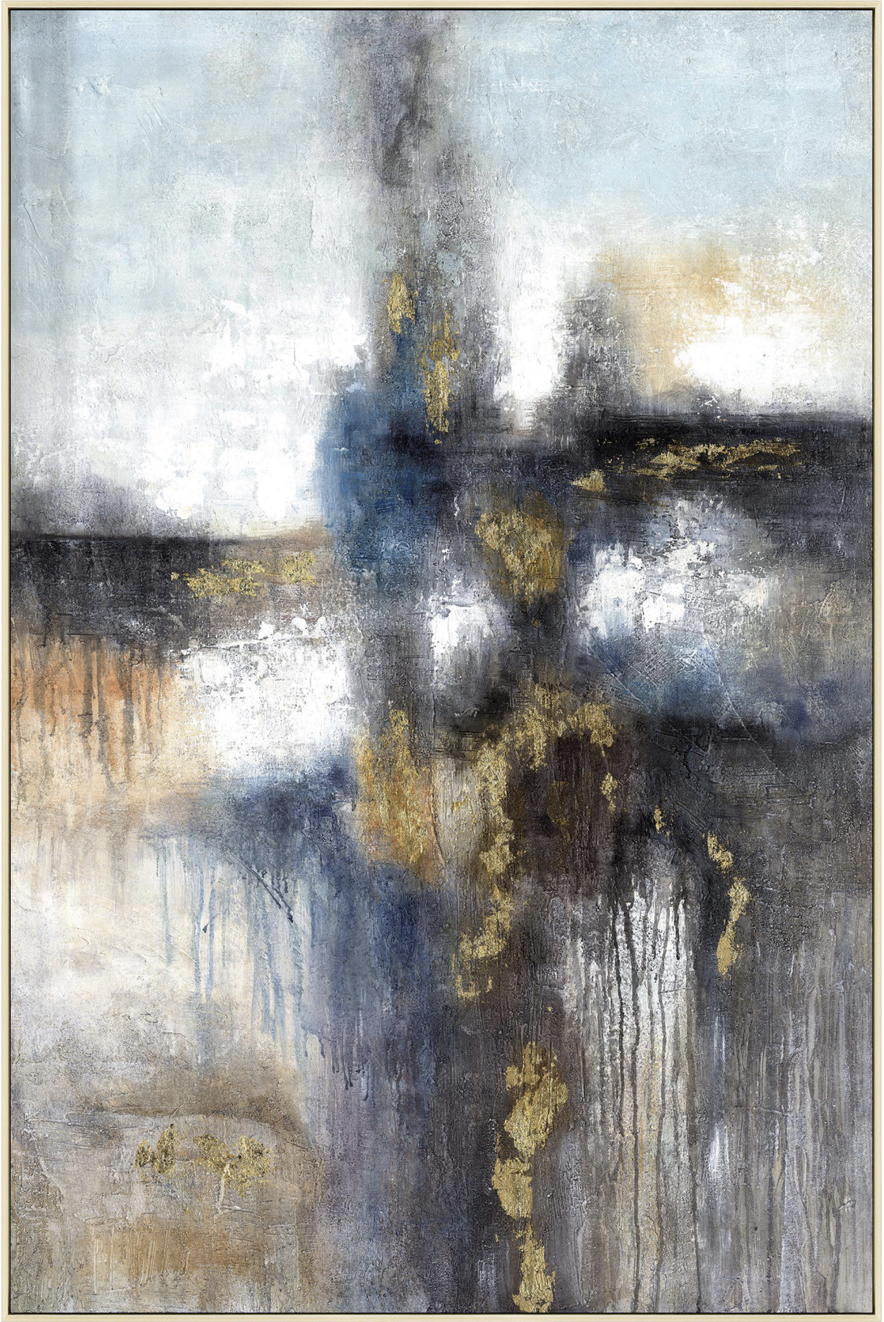 Model SULFUR wyróżnia ręczne malowanie oraz malarska, gruba struktura, która nadaje powierzchni głębię i efekt galerii sztuki. Kompozycja została wykonana na płótnie z wyraźną, grubą fakturą, dzięki czemu każdy detal pozostaje doskonale widoczny. Całość uzupełnia rama w odcieniu szampańskiego złota, podkreślająca elegancki charakter dekoracji. Na obrazie dominują odcienie błękitu, grafitu, szarości i bieli, wzbogacone subtelnymi złotymi akcentami, które pięknie współgrają z drewnem, kamieniem oraz czarnymi dodatkami.