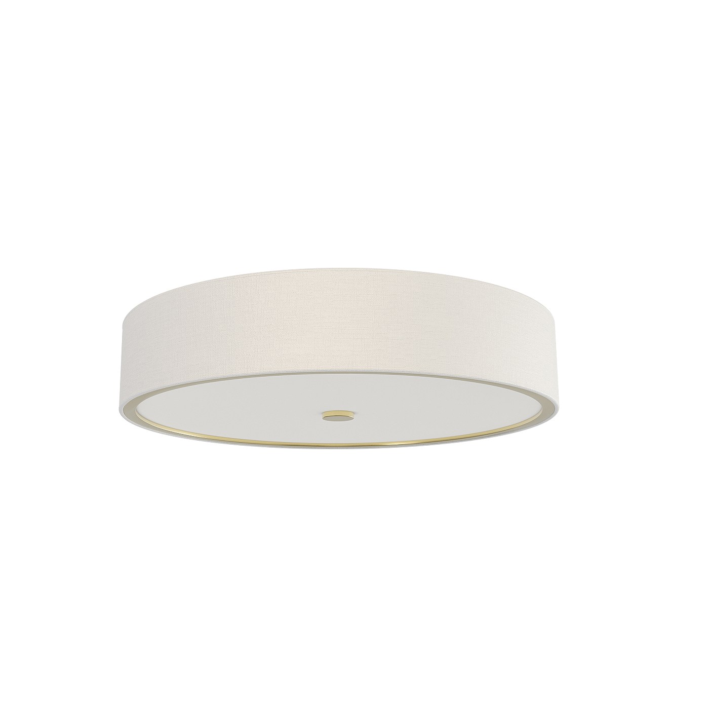 Wyróżnikiem lampy sufitowej jest płaski, okrągły klosz wykonany z wysokogatunkowej tkaniny w odcieniu jasnego kremu, o delikatnej, matowej fakturze. Subtelne detale, takie jak cienka złotawa ramka oraz centralny element mocujący, dopełniają kompozycji i nadają jej szyku. Zamknięty od spodu klosz ze szklaną osłoną zapewnia miękkie, rozproszone światło oraz elegancki, lekki charakter oprawy. Niska konstrukcja lampy sprawia, że produkt świetnie sprawdzi się nawet w pomieszczeniach z ograniczoną wysokością.