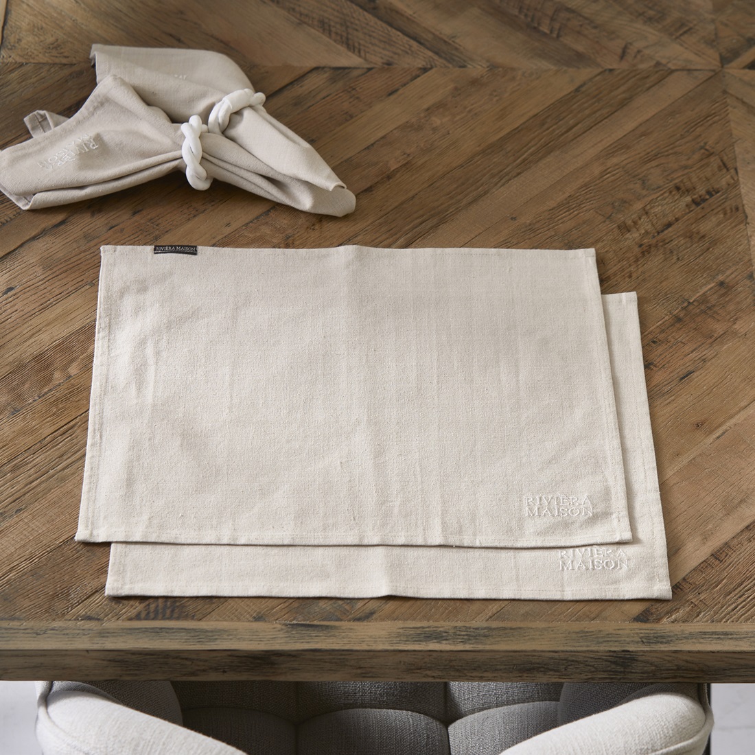Każda z podkładek została wykonana z wysokiej jakości tkaniny o naturalnym składzie, co gwarantuje trwałość i łatwość w utrzymaniu czystości. Beżowy kolor to klasyka, która nigdy nie wychodzi z mody – pasuje do różnorodnych zastaw stołowych oraz dodatków. W rogu znajduje się haftowane logo Riviera Maison, które podkreśla ekskluzywny charakter i markową jakość produktu.