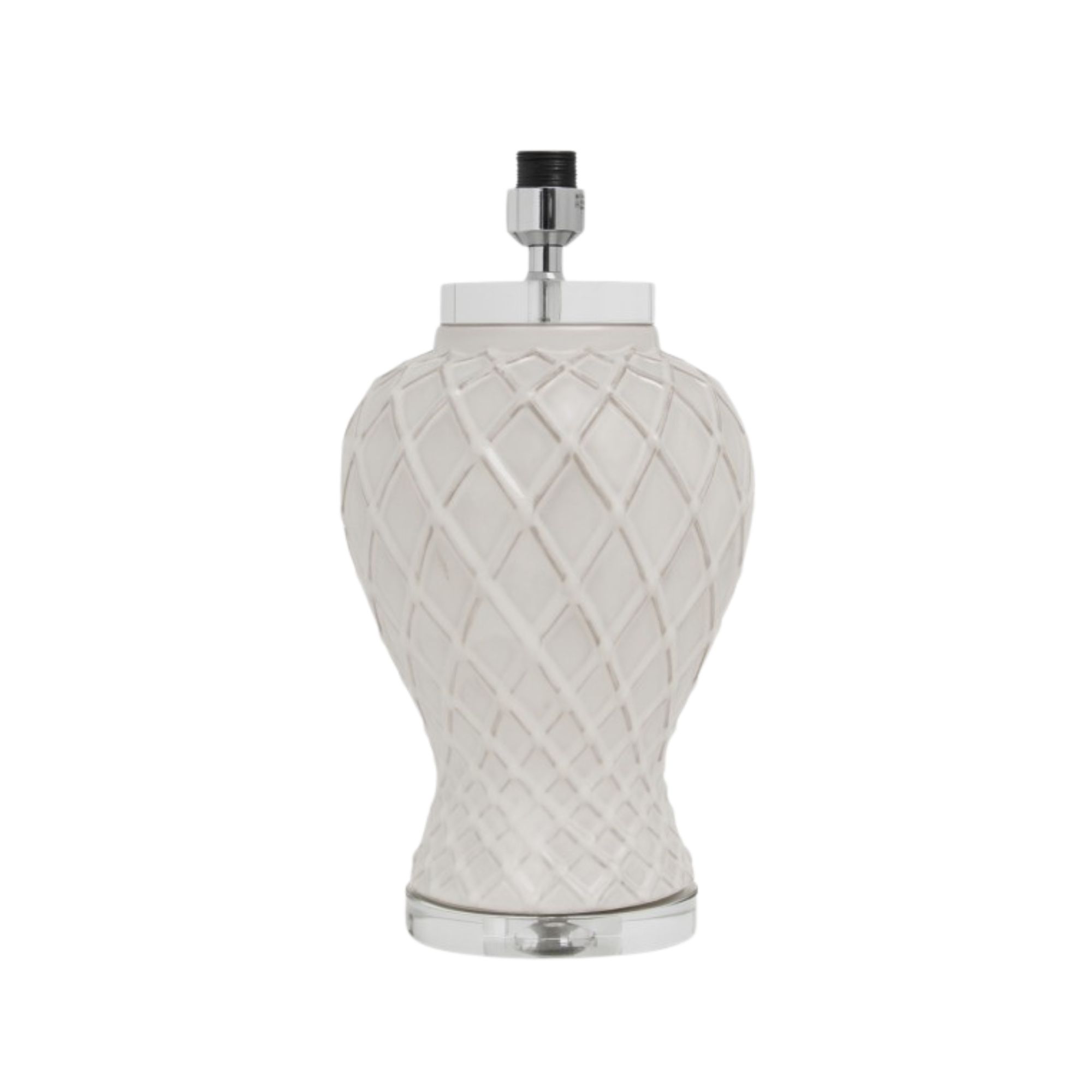 Bazę stanowi porcelanowa podstawa w kremowo-białym odcieniu, ozdobiona tłoczonym wzorem karo z delikatnym, beżowym konturem. Faktura nadaje formie głębi oraz eleganckiego charakteru, który dodatkowo podkreśla kryształowy postument. Wykończenie całości eleganckim elementem w kolorze chrom sprawia, że produkt prezentuje się niezwykle stylowo i nowocześnie. Brak abażuru daje możliwość samodzielnego dopasowania klosza według własnych preferencji, co czyni tę podstawę wyjątkowo uniwersalną.