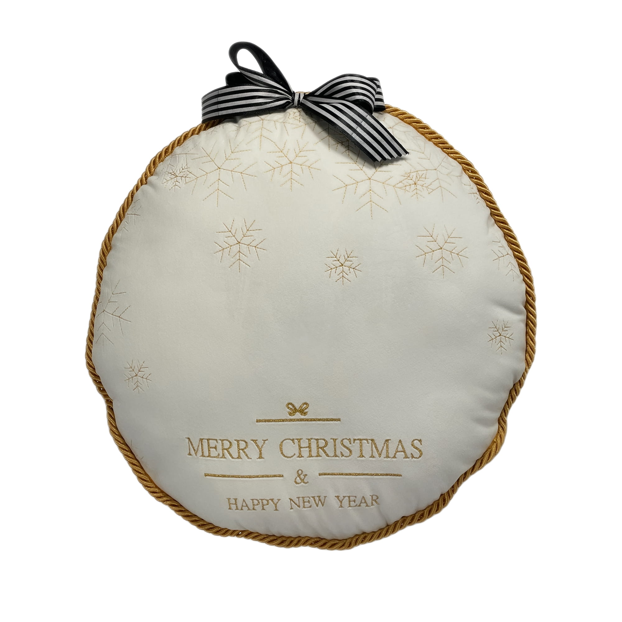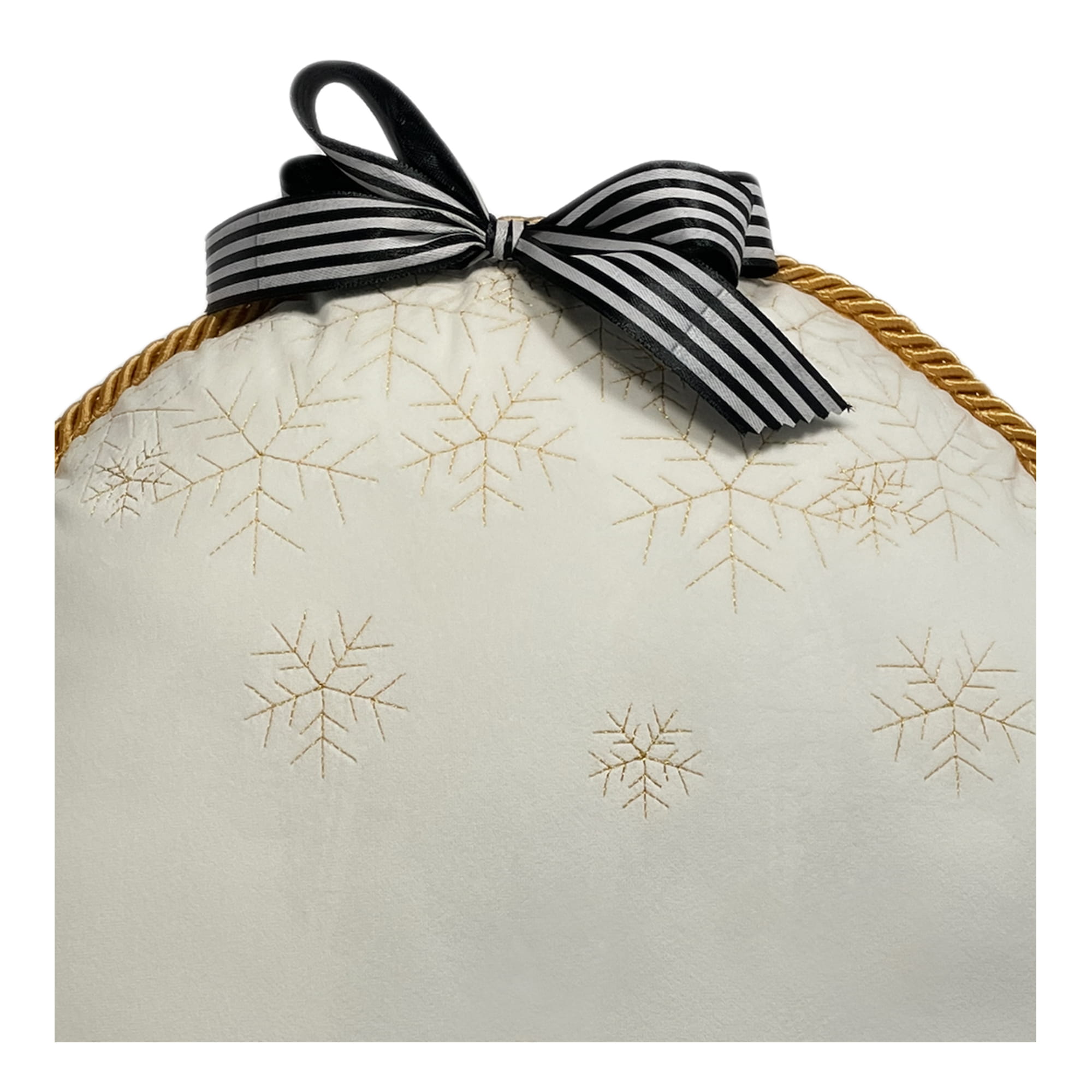 Miękka i aksamitna w dotyku, elegancka poduszka w kształcie bombki z haftowanym świątecznym motywem i zodobną kokardką w biało-czarne paseczki, zapinana na kryty zamek. Poduszka jest w pełni personalizowana, z możliwością wyboru tkaniny, koloru oraz wykończenia. Nasze wyjątkowe i oryginalne poduszki tworzone z pasją do piękna to najwyższa jakość materiałów w połączeniu z różnorodnością kolorów tkanin, które zapewnią niepowtarzalny klimat w każdym wnętrzu.