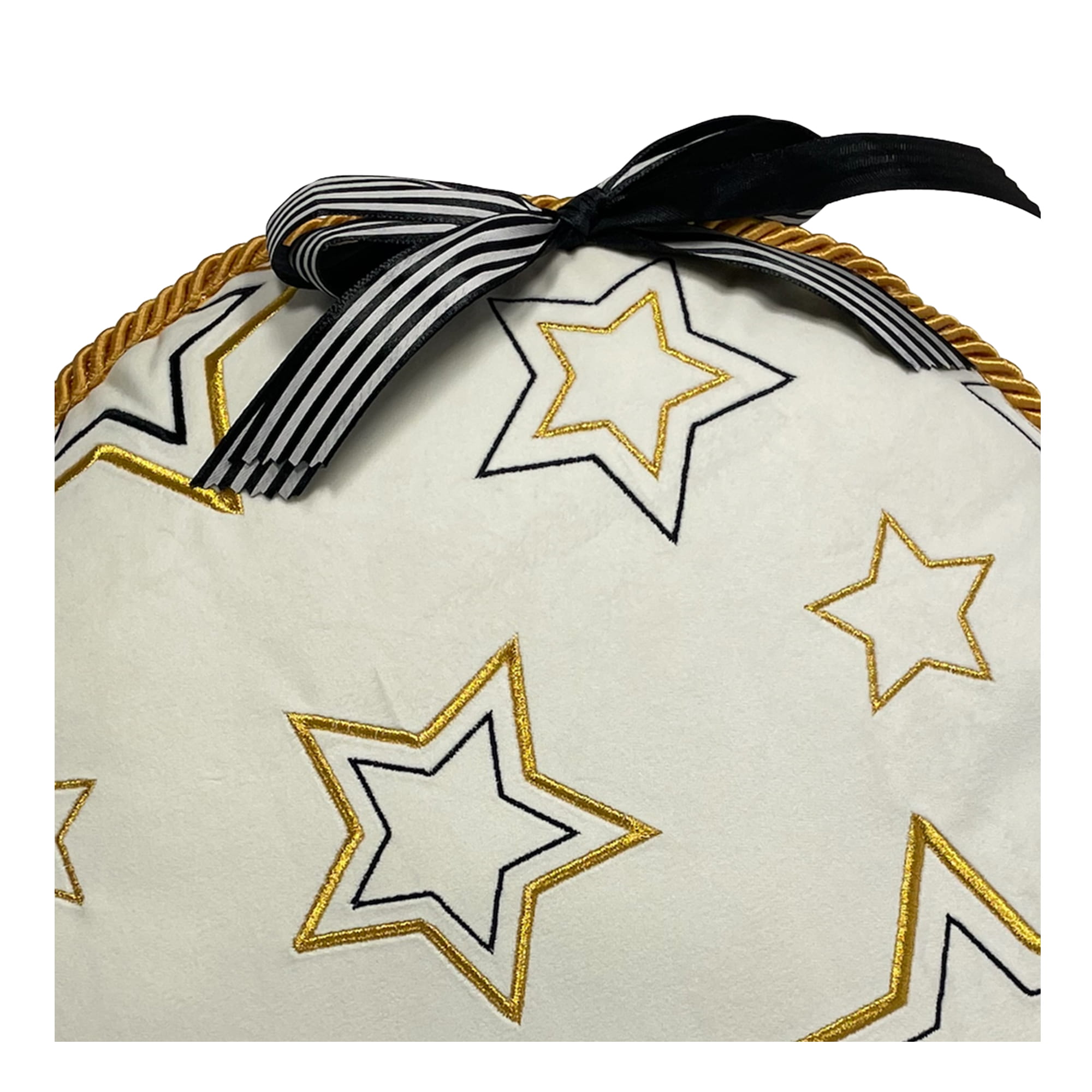 Miękka i aksamitna w dotyku, elegancka poduszka w kształcie bombki z haftowanym świątecznym motywem i zodobną kokardką w biało-czarne paseczki, zapinana na kryty zamek. Poduszka jest w pełni personalizowana, z możliwością wyboru tkaniny, koloru oraz wykończenia. Nasze wyjątkowe i oryginalne poduszki tworzone z pasją do piękna to najwyższa jakość materiałów w połączeniu z różnorodnością kolorów tkanin, które zapewnią niepowtarzalny klimat w każdym wnętrzu.
