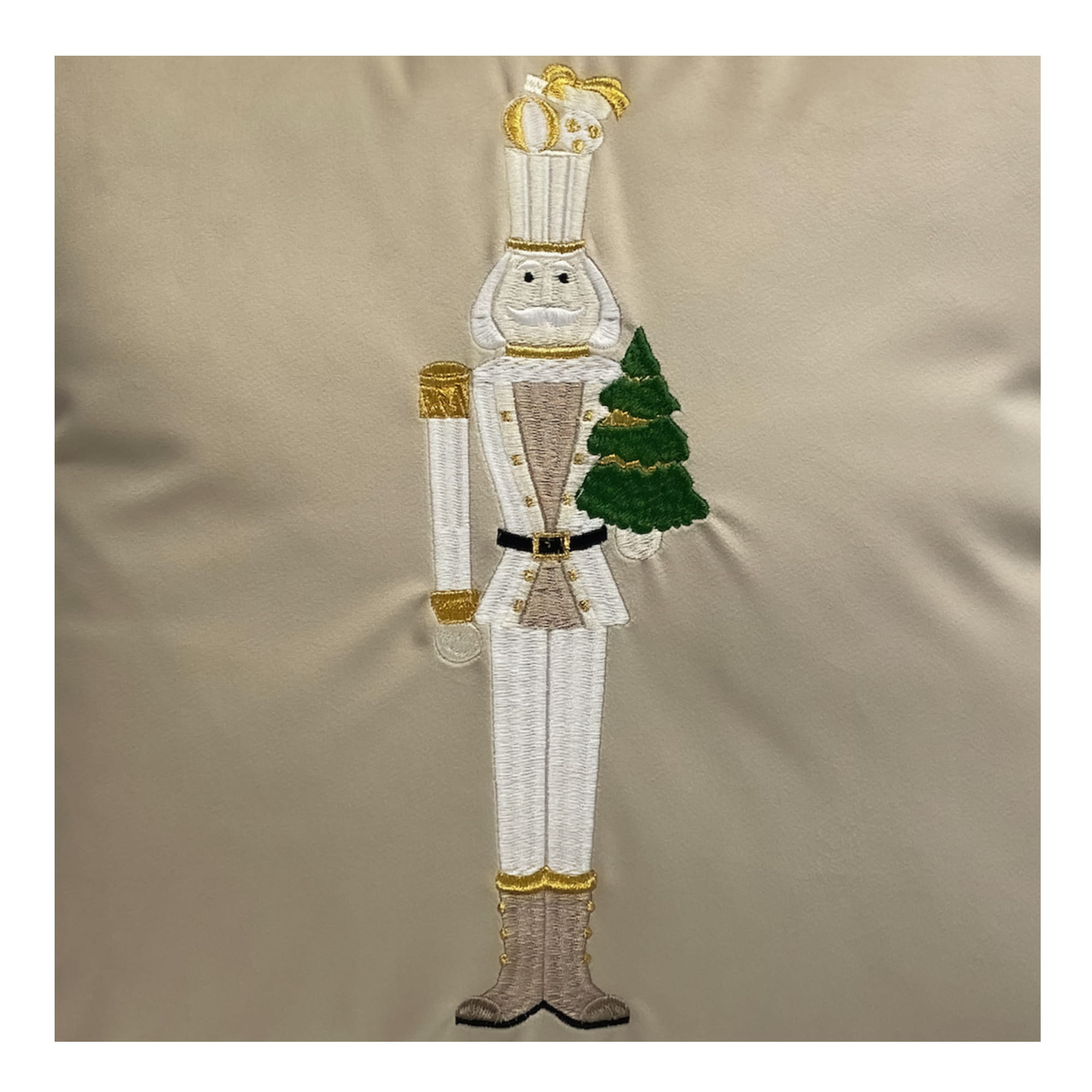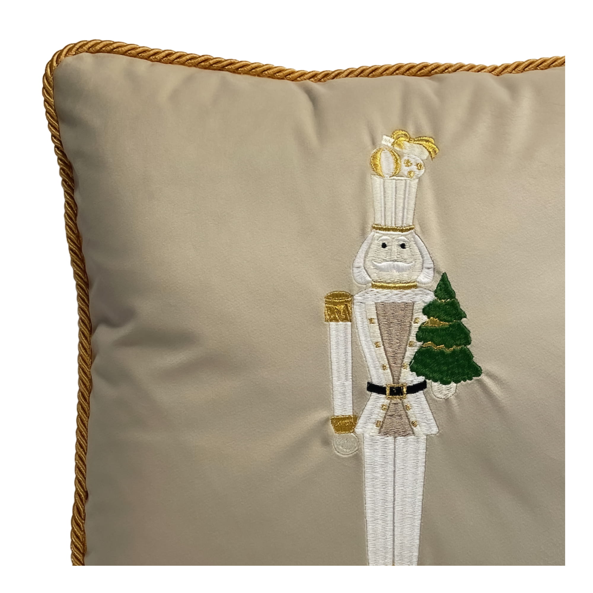 Poduszka na zdjęciu poglądowym wykonana jest w tkaninie Amor 4303 pastelowy jasny beż, haft w kolorze zielonym, złotym i szampańskim, obszyta sznurem dekoracyjnym w kolorze złotym.