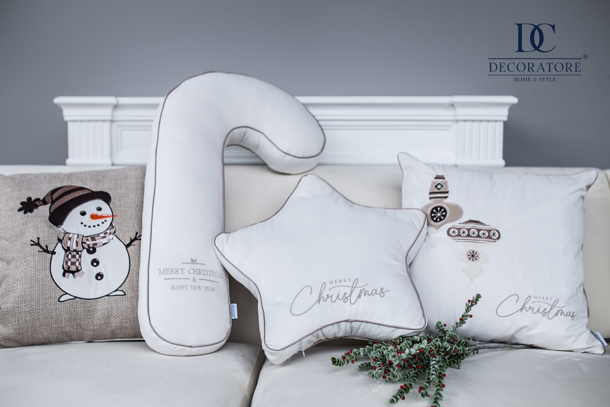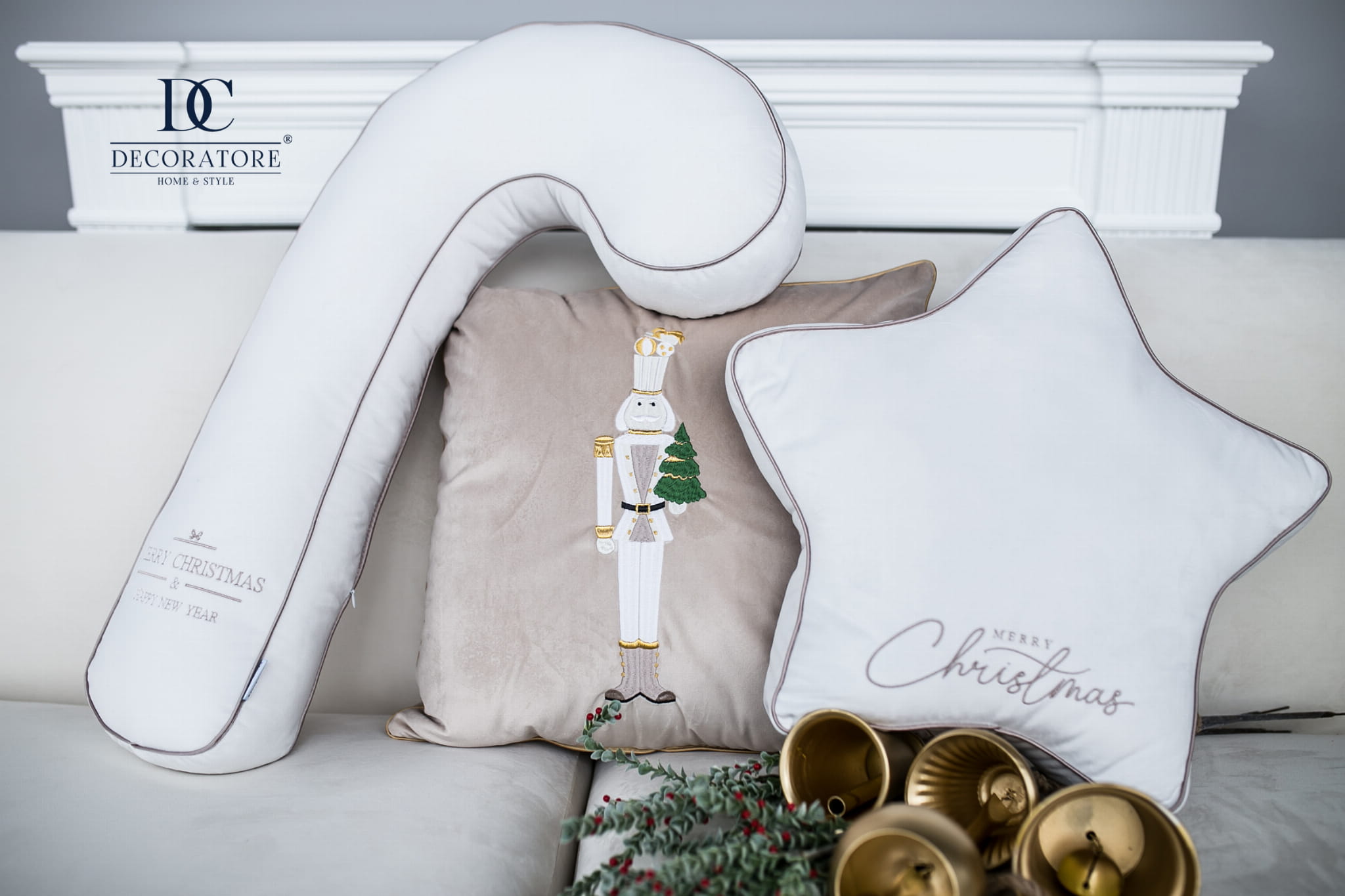 Poduszka została wykonana z welurowej aksamitnej tkaniny w kolorze białym, która nadaje jej eleganckiego i klasycznego charakteru. Haftowany napis "Merry Christmas" oraz subtelna wypustka w kolorze szampańskiego beżu dodają jej wyrafinowanego wyglądu. Wymiary 70 cm wysokości i 37 cm szerokości sprawiają, że doskonale prezentuje się na kanapie, fotelu czy przy świątecznym kominku, stając się centralnym punktem świątecznego wystroju.