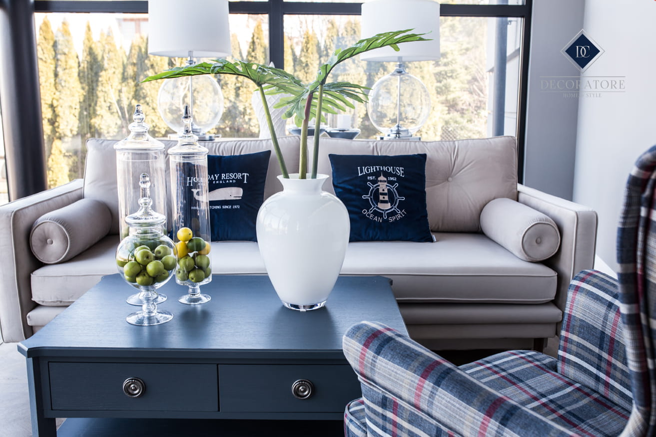 Poduszka prezentowana na zdjęciu poglądowym wykonana jest w tkaninie Bluvel granat hampton, haft w kolorze biało-szampańskim i wypustka w kolorze szampańskim.