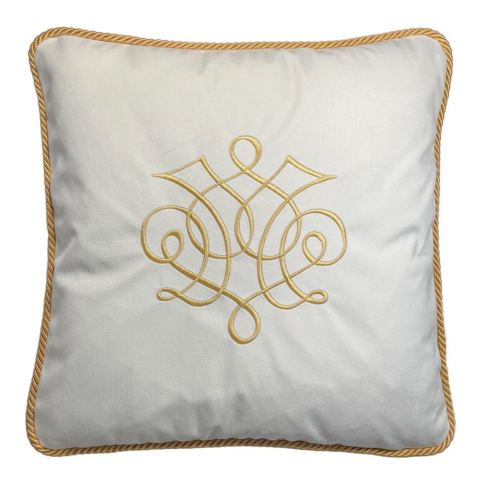 Poduszka na zdjęciu poglądowym wykonana jest w tkaninie Amor 4317 śmietankowa biel ze złotym haftem i sznurem.