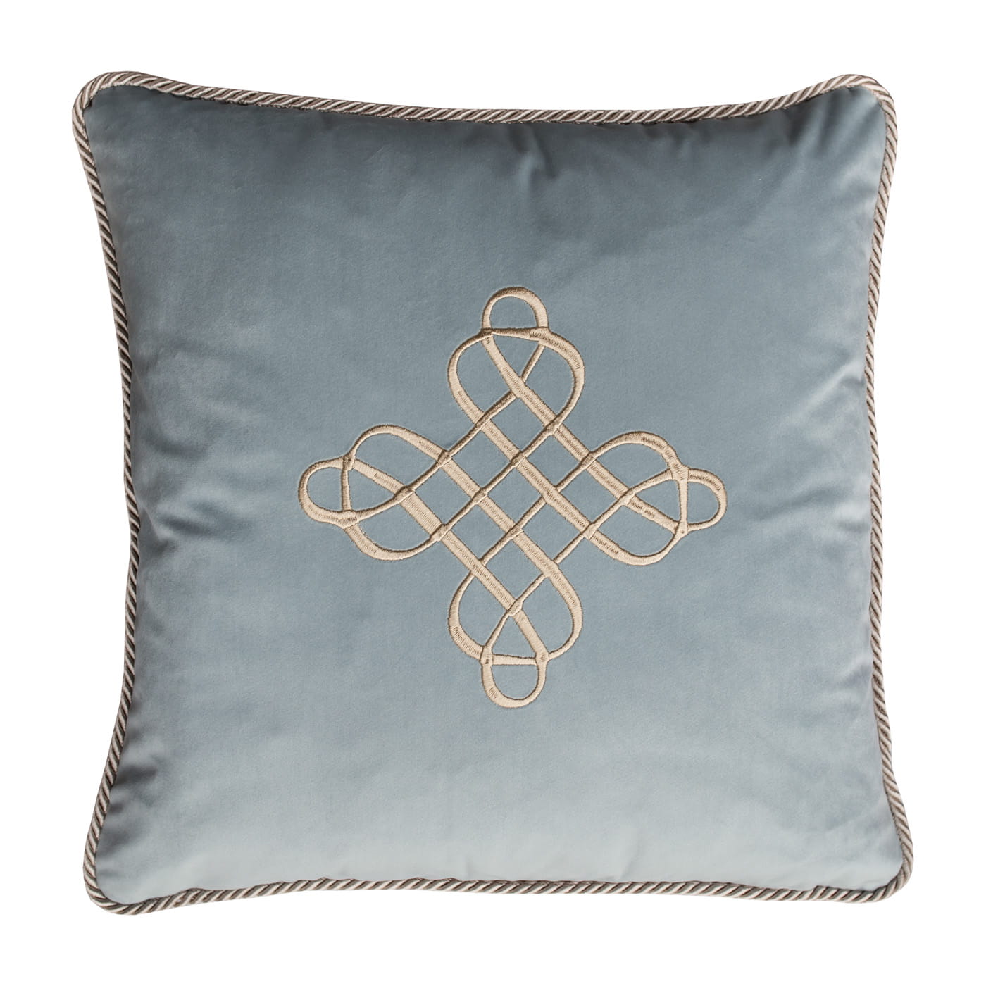 Poduszka na zdjęciu poglądowym wykonana jest w tkaninie Magic Velvet 2238 pastelowa mięta z szampańskim haftem i szampańskim sznurem.