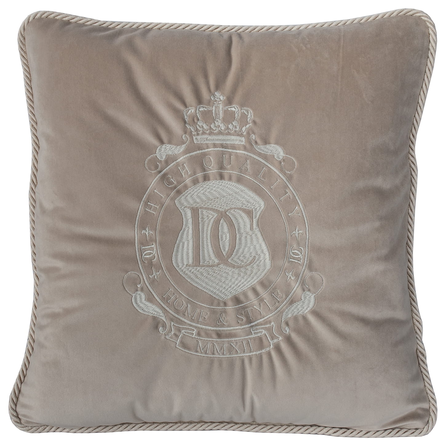 Poduszka z przodu na zdjęciu poglądowym wykonana jest w tkaninie Amor 4303 Pastelowy Jasny Beż z kremowym haftem i sznurem.