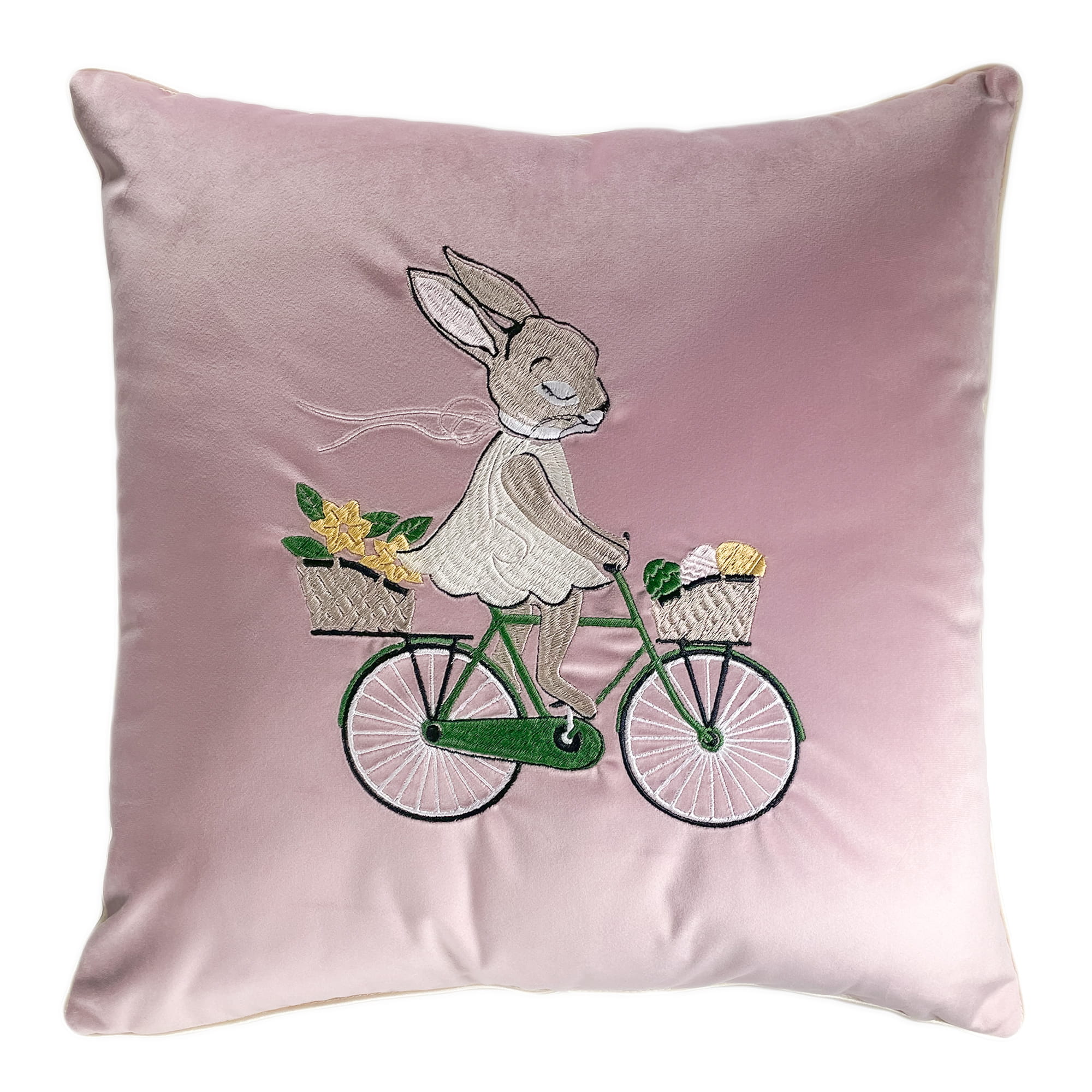 Poduszka Haftowana Dekoracyjna Zajączek Cyklistka - Różne Kolory Tkanin