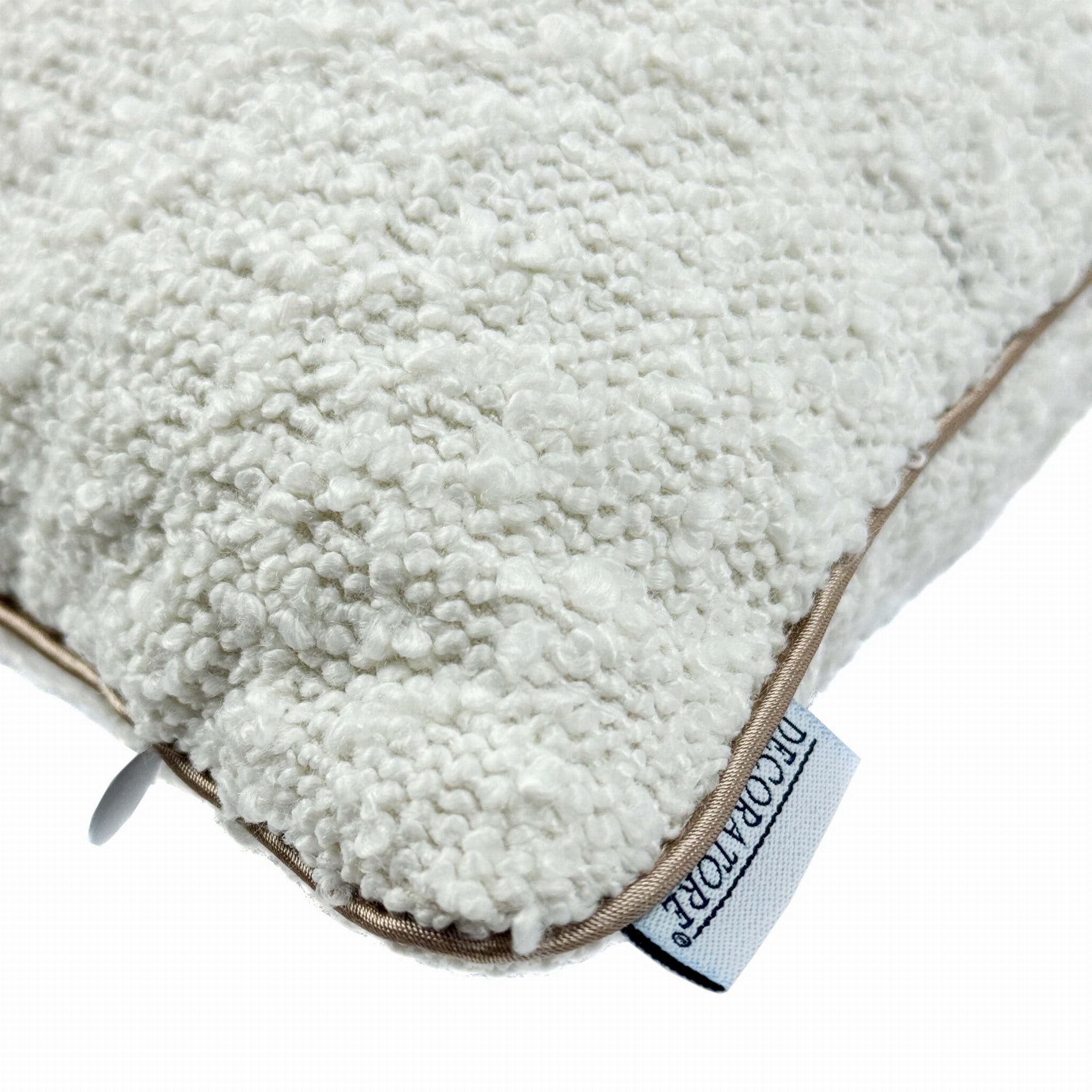 Poduszka na zdjęciu poglądowym uszyta została w tkaninie boucle w kolorze bialym, haft w kolorze beżowo-brązowym, wypustka szampańska. Wymiar poduszki ze zdjęcia poglądowego 45x45cm