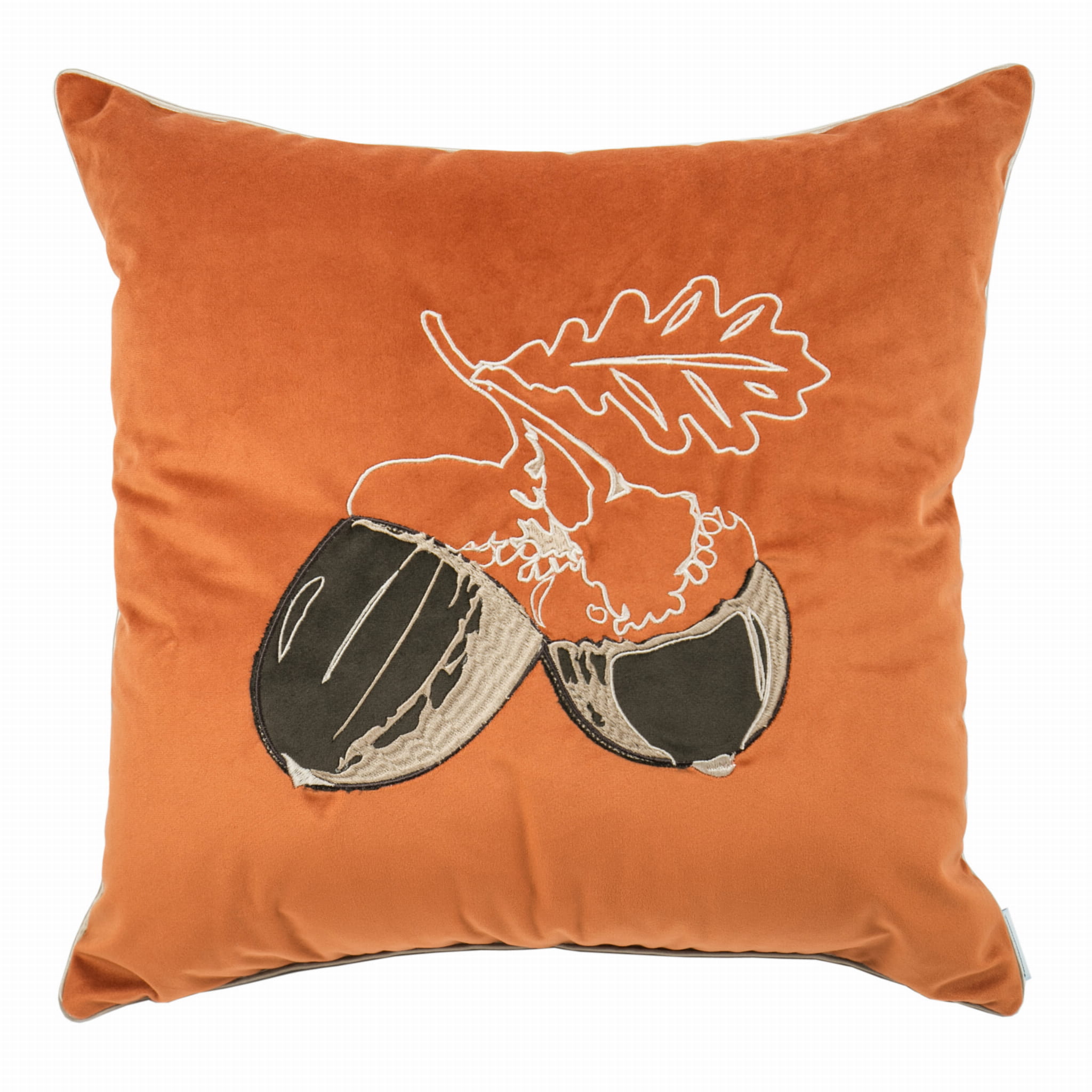 Poduszka na zdjęciu poglądowym wykonana jest w tkaninie Magic Velvet Pomartańczowy, haft w kolorze szampańsko-brązowym, wypustka w kolorze szampańskim.