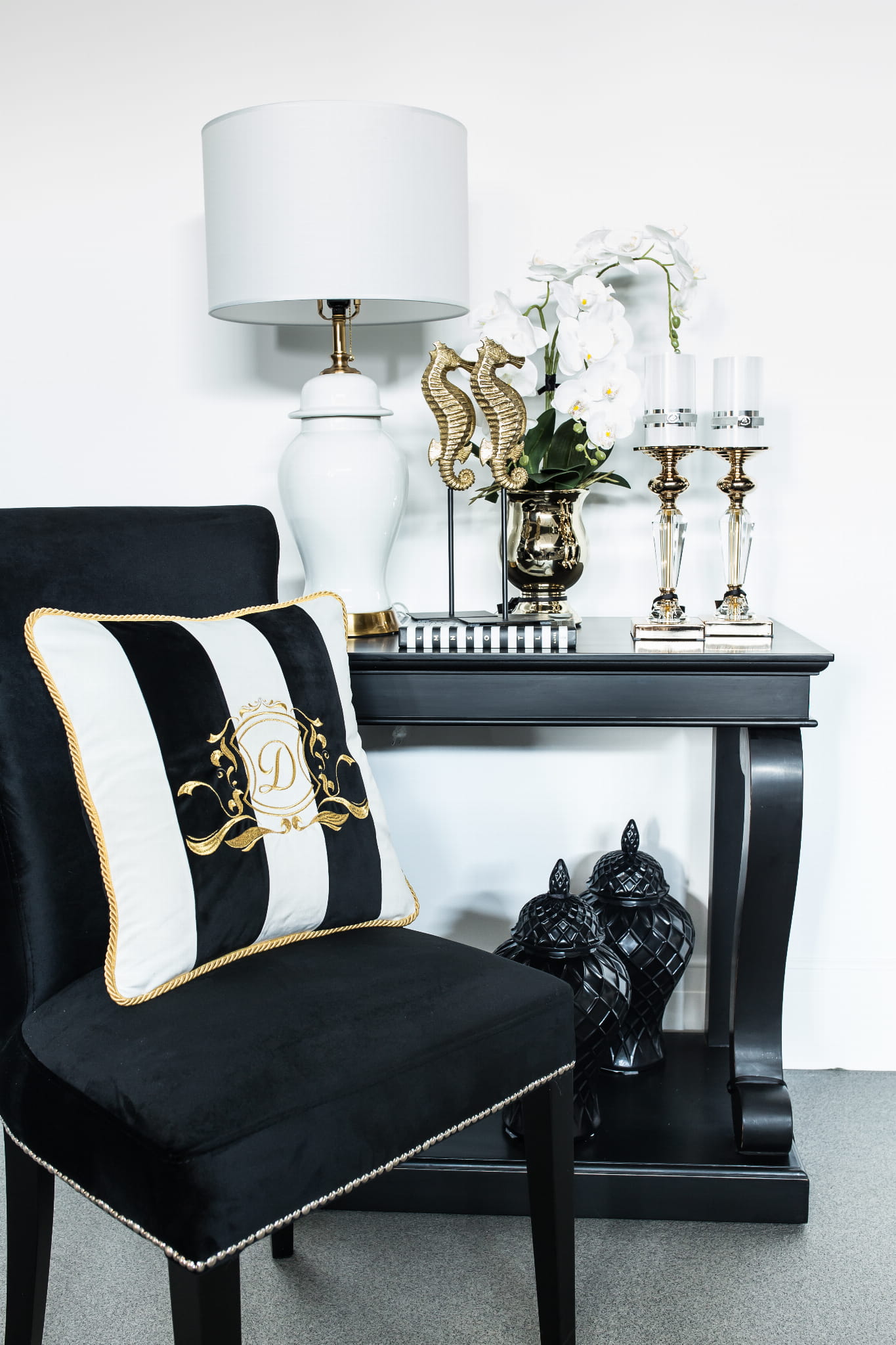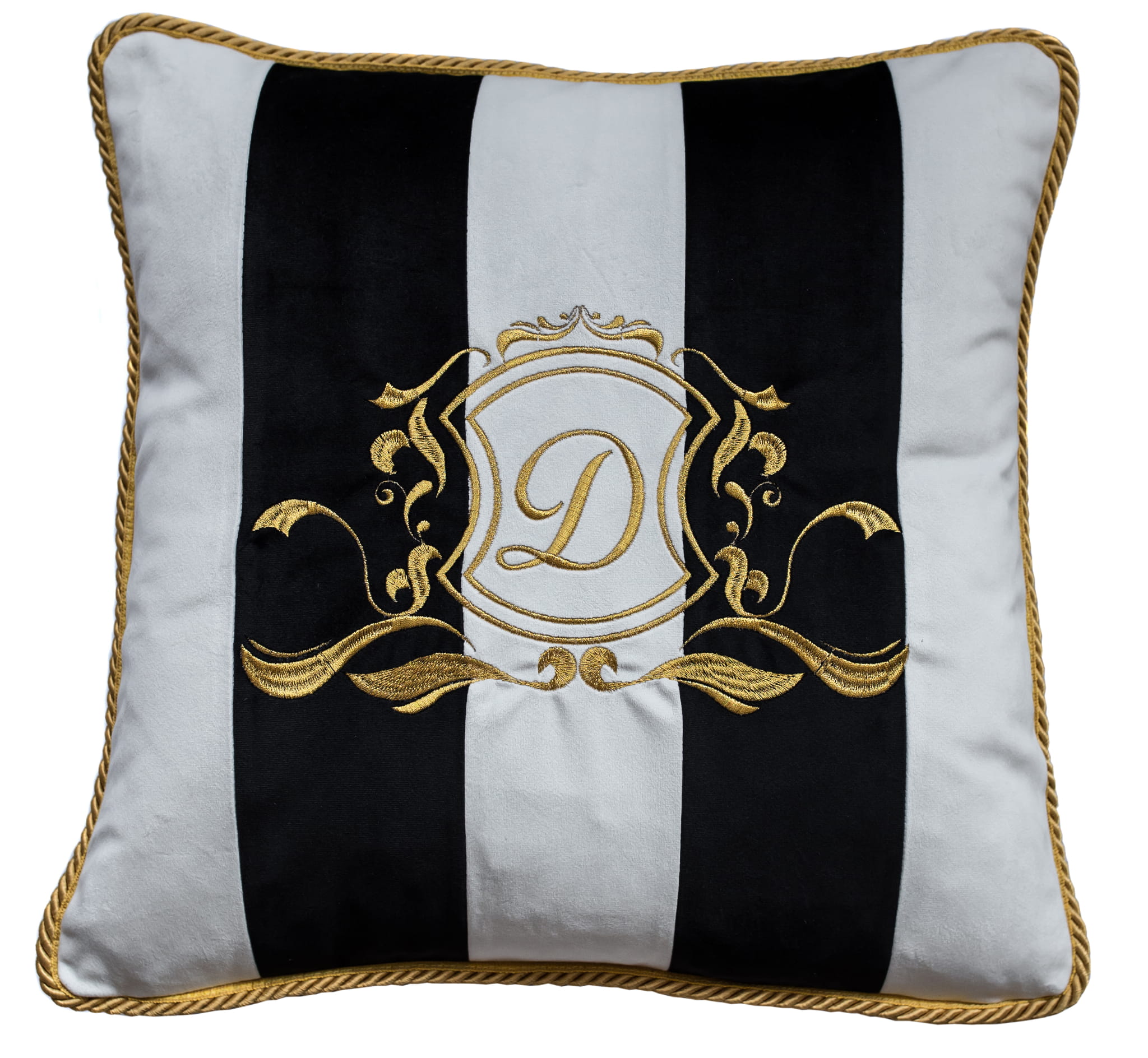 Poduszka prezentowana na zdjęciu poglądowym wykonana jest w tkaninie Bluvel 19 czarny oraz Amor 4317, haft i sznur w kolorze złotym.