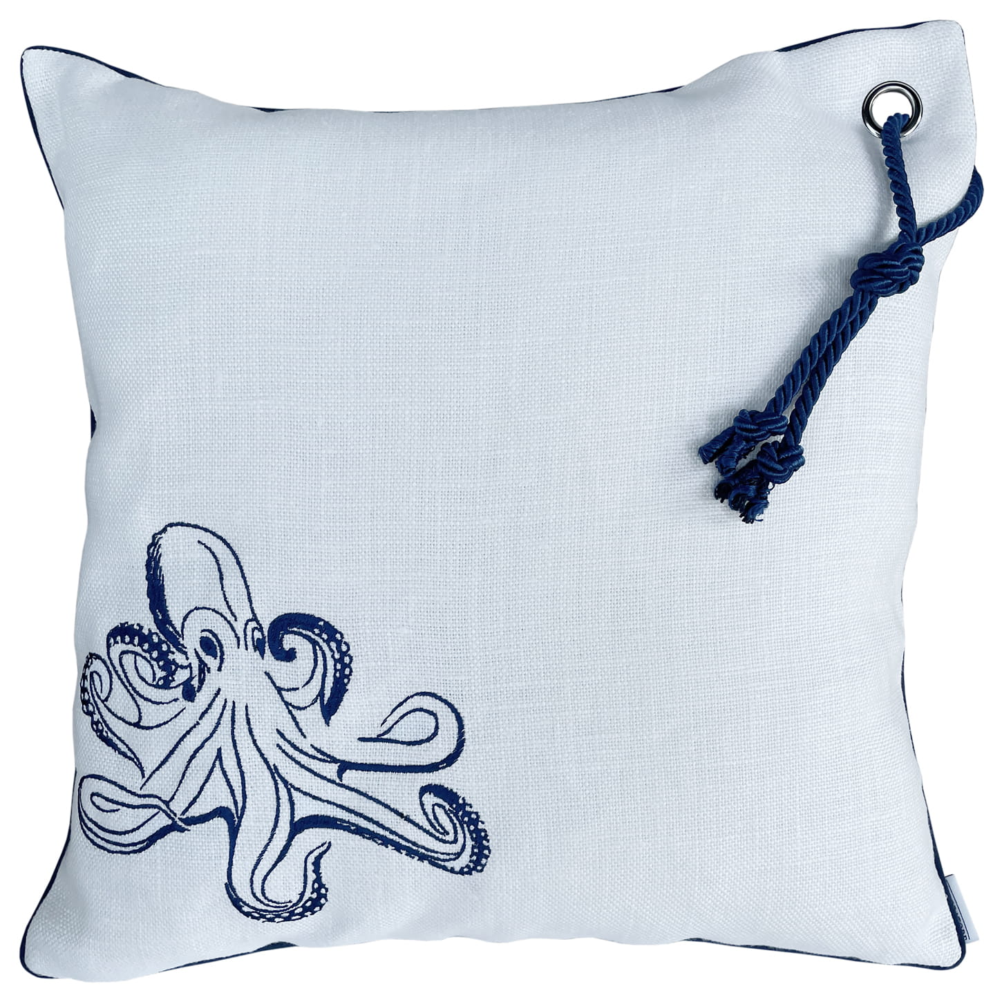 Ta stylowa poduszka personalizowana zachwyca nie tylko oryginalnym haftem, ale także starannością wykonania. Wykonana z wysokiej jakości lnu z delikatną domieszką, oferuje trwałość oraz elegancki wygląd. Haft przedstawiający ośmiornicę w granatowym kolorze jest nie tylko precyzyjny, ale również nadaje poduszce wyjątkowy, morski charakter. Dodatek w postaci granatowej wypustki oraz dekoracyjnego sznurka dopełnia całości, tworząc spójną i estetyczną kompozycję.
