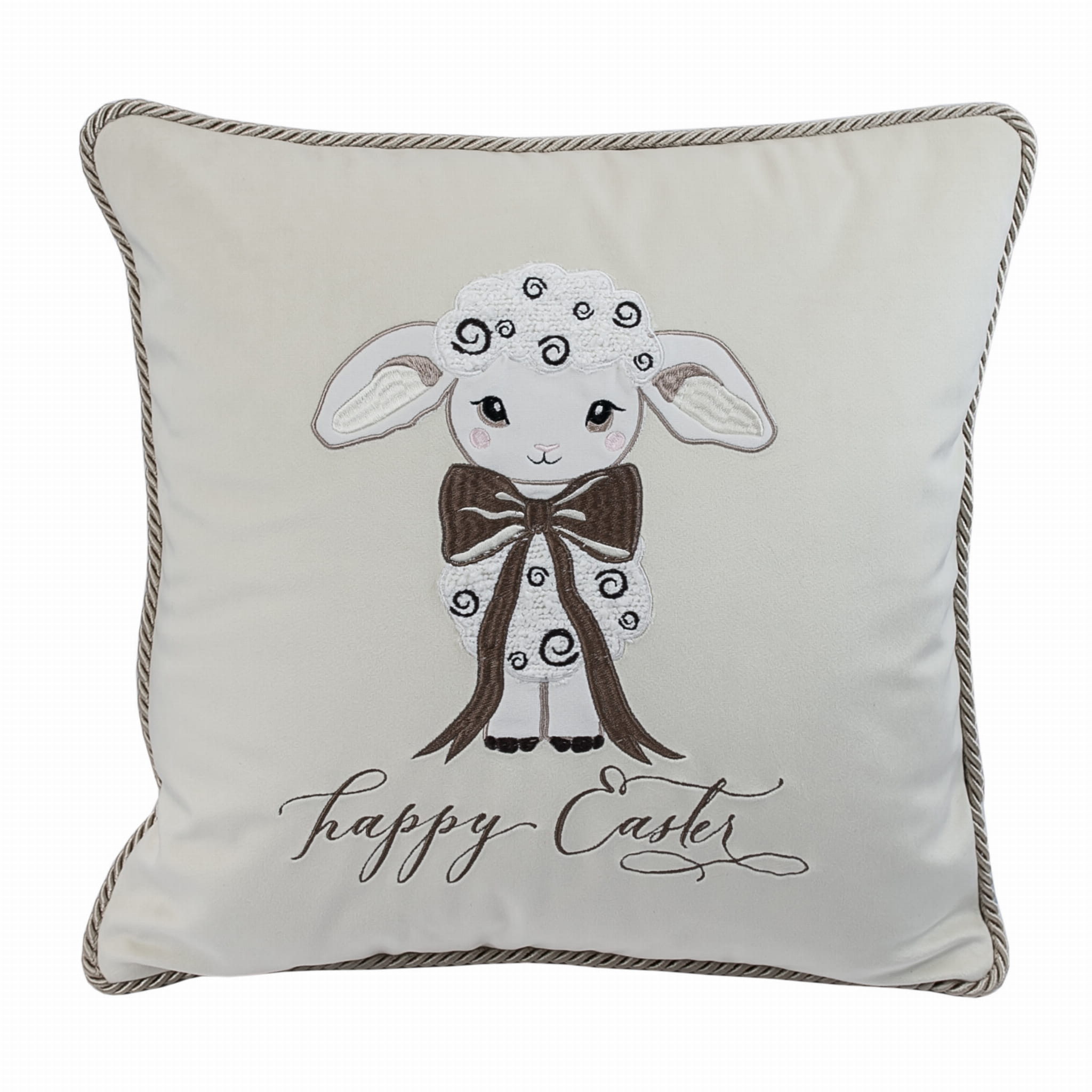 Poduszka została wykonana z aksamitnie miękkiego weluru, który nie tylko pięknie się prezentuje, ale także jest wyjątkowo przyjemny w dotyku. Model na zdjęciu został zaprojektowany w odcieniu śmietankowej bieli (tkanina Amor) i obszyty dekoracyjnym sznurem w kolorze szampańskiego beżu. Starannie wykonany haft przedstawia uroczą owieczkę z kokardą, a jego wielokolorowe detale dodają wyjątkowego charakteru.