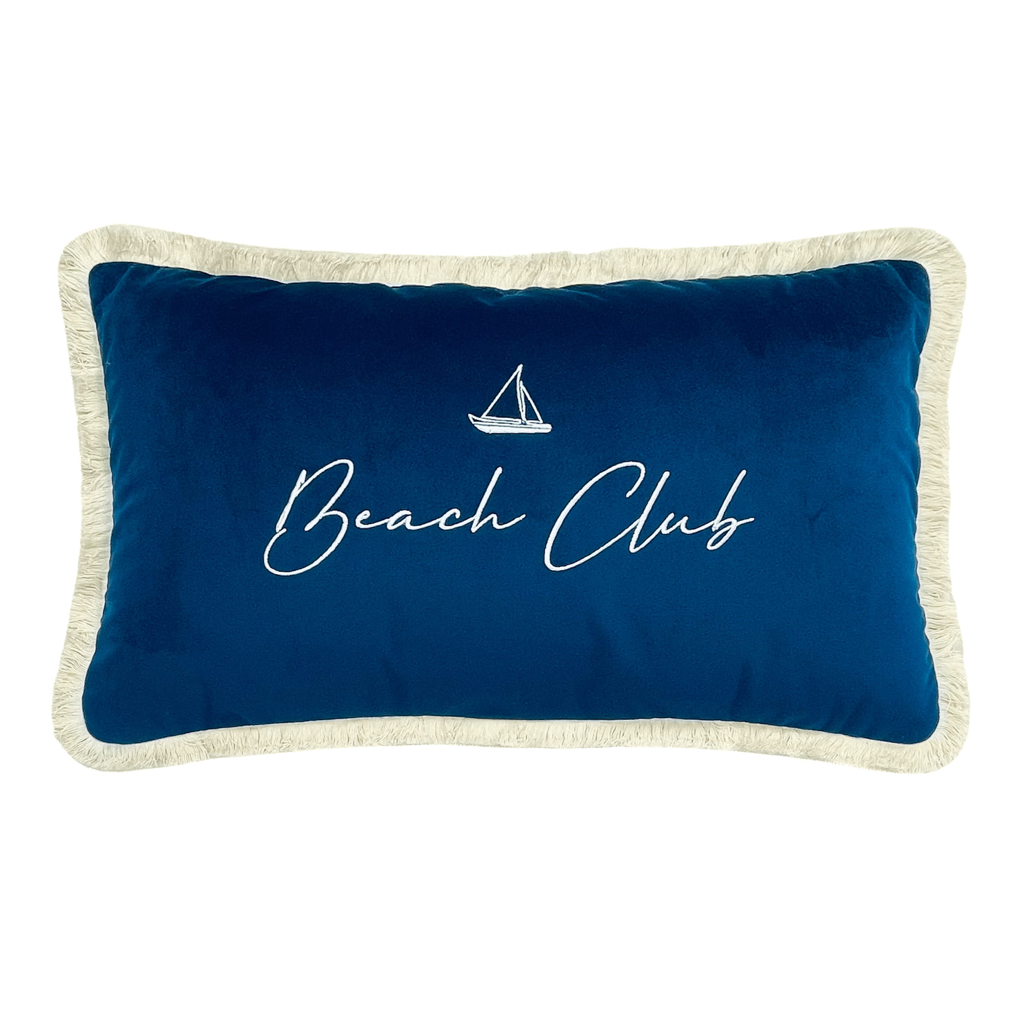 Poduszka prezentowana na zdjęciu poglądowym wykonana jest w tkaninie Bluvel Granat Hamptons, haft i frędzle w kolorze kremowym.