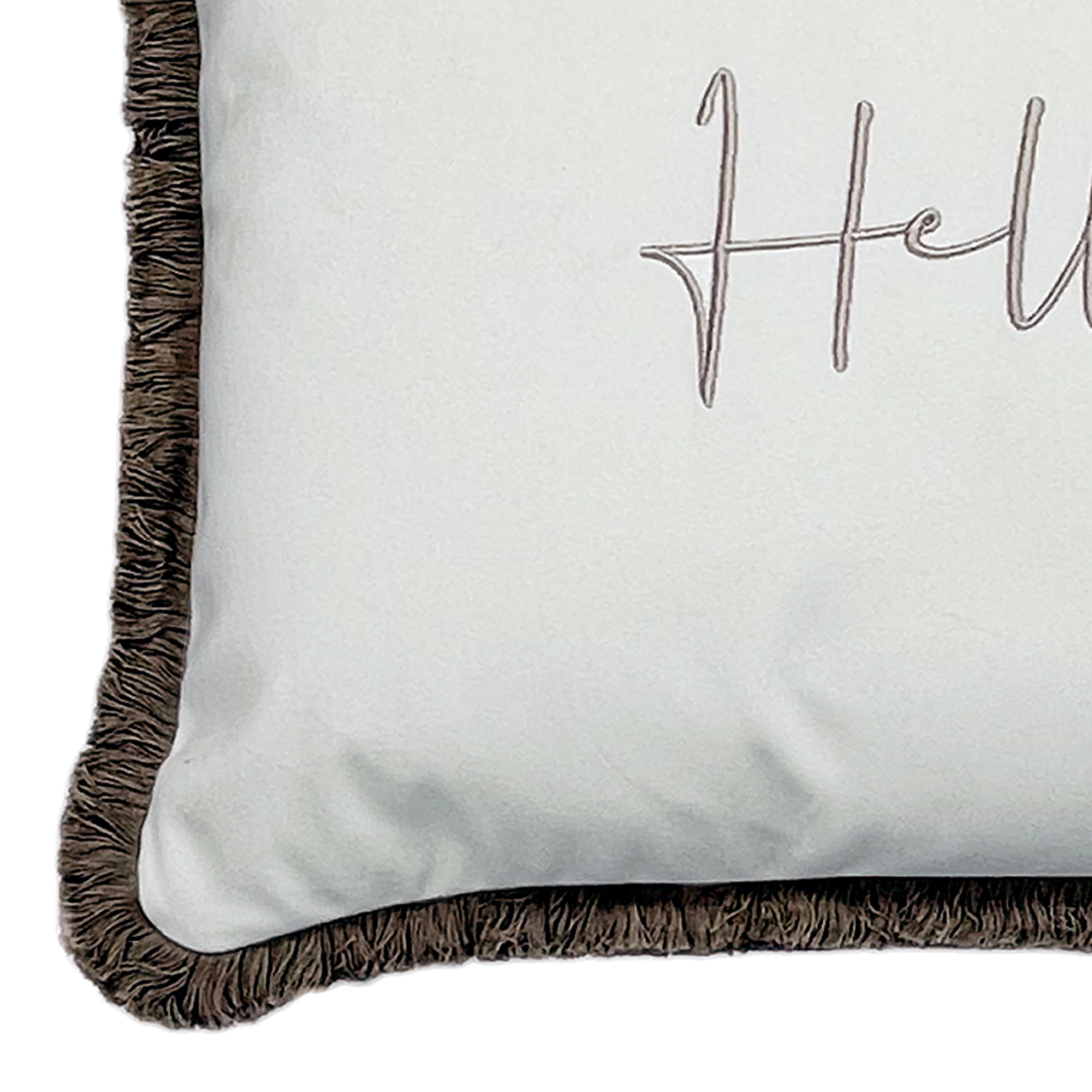Poduszka prezentowana na zdjęciu poglądowym wykonana jest w tkaninie Bluvel 22 Kremowy, haft w kolorze szampańskim, frędzle w kolorze beżowym.