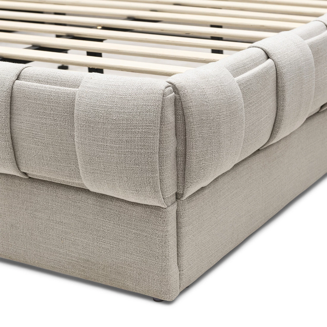 Prezentowane łóżko wyróżnia się swoją ręcznie tkaną tapicerką, wykonaną z wysokiej jakości lnu Mouliné w odcieniu Fabulous Flax. Jego tekstura jest delikatna, a jednocześnie niezwykle wytrzymała. Duże, eleganckie pikowania na zagłówku i bocznych częściach ramy podkreślają jego wyjątkowy wygląd, nadając wnętrzu stylowy charakter. Model ten pochodzi z kolekcji Room 48, co sprawia, że możesz dopasować do niego inne elementy, takie jak pufy, krzesła czy podnóżki, tworząc spójną aranżację w sypialni.