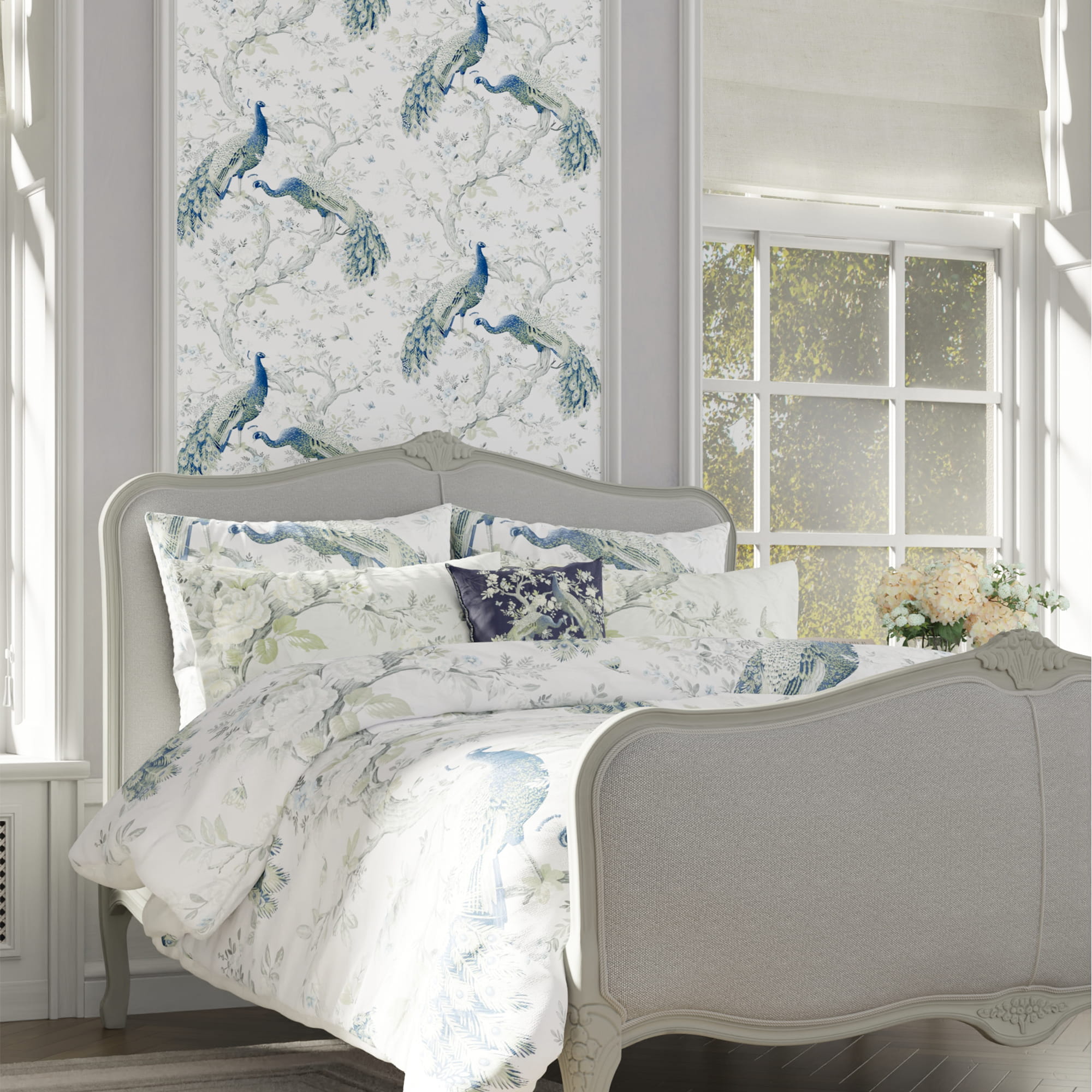 Łóżko Provencale w kolorze szarym, o wymiarach 191x216x120cm, ma tapicerowane wezgłowie oraz rzeźbione detale, które tworzą gustowne i elegancką ramę. Łóżko sprzedawane jest bez materaca. Wymaga montażu.
