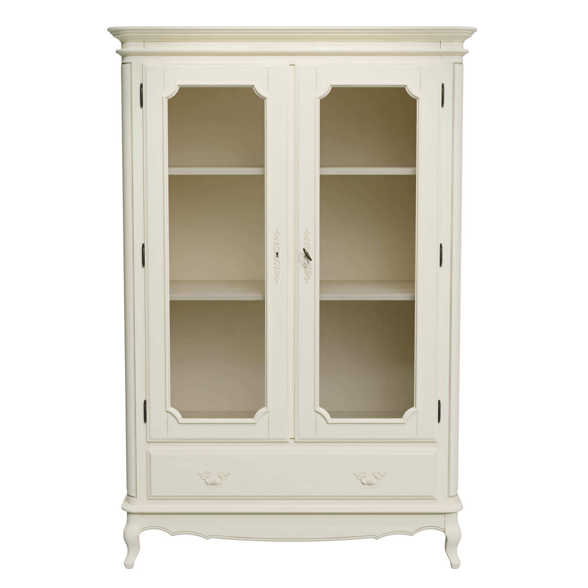 Witryna Provencale w kolorze kości słoniowej, o wymiarach 120x45x180cm, ma dwoje przeszklonych drzwiczek zamykanych na kluczyk, za którymi znajdują się dwie półki oraz jedną szufladę z ozdobnym uchwytem. Całość mebla prezentuje się niezwykle elegancko i klasycznie.