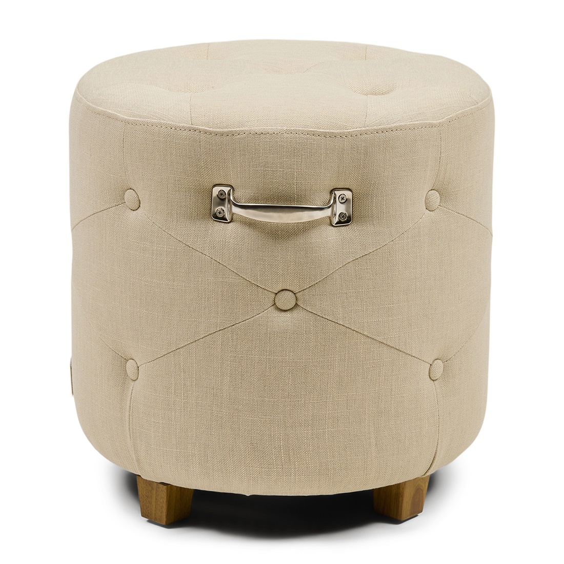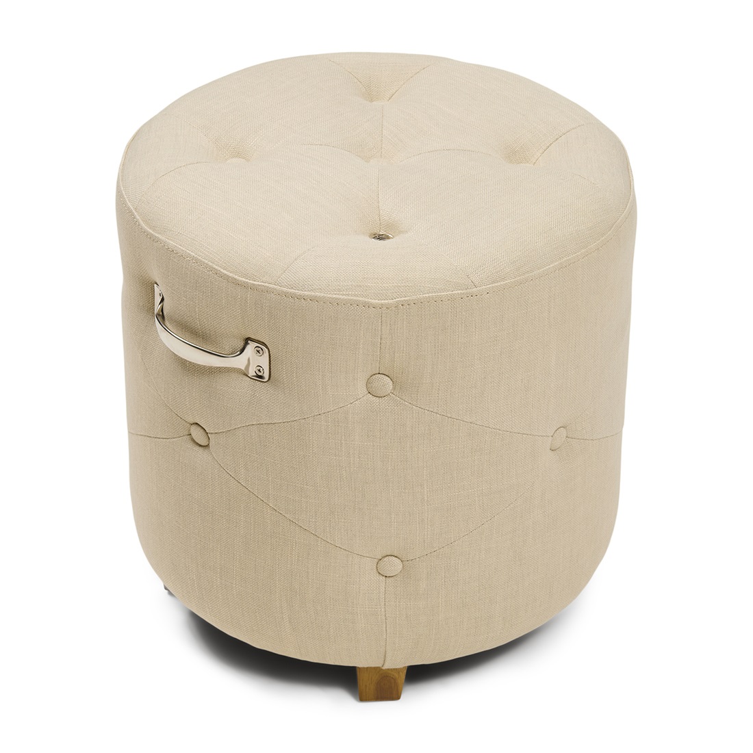 Puf wyróżnia się miękkim lnianym obiciem o przyjemnej w dotyku fakturze i naturalnej kolorystyce. Zastosowanie dekoracyjnego pikowania oraz metalowego uchwytu po bokach dodaje mu elegancji i charakteru, podkreślając jego stylową formę. Stabilne drewniane nóżki zapewniają trwałość, a staranne wykończenie świadczy o wysokiej jakości wykonania.