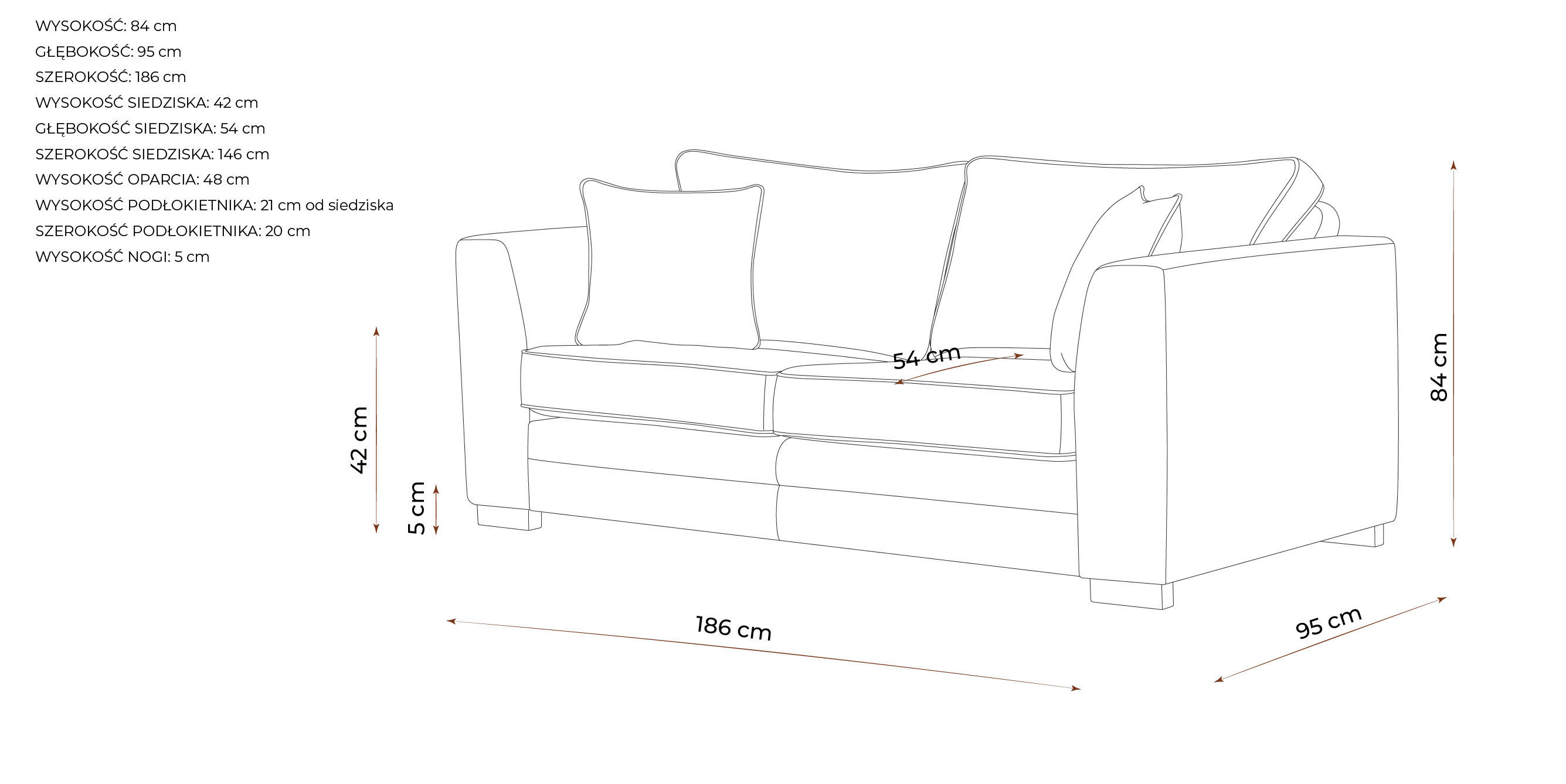 Konstrukcja opiera się na ramie z litego drewna bukowego, co zapewnia stabilność oraz długowieczność. Powierzchnia obita została miękką, przyjemną w dotyku tkaniną tapicerską, która jest nie tylko trwała, ale również łatwa do utrzymania w czystości. Sofa posiada duże, wygodne poduchy oparciowe oraz siedziskowe z zdejmowanymi pokrowcami, co ułatwia codzienną pielęgnację. Drewniane nogi w wybarwieniu do wyboru stanowią stylowe dopełnienie całości.